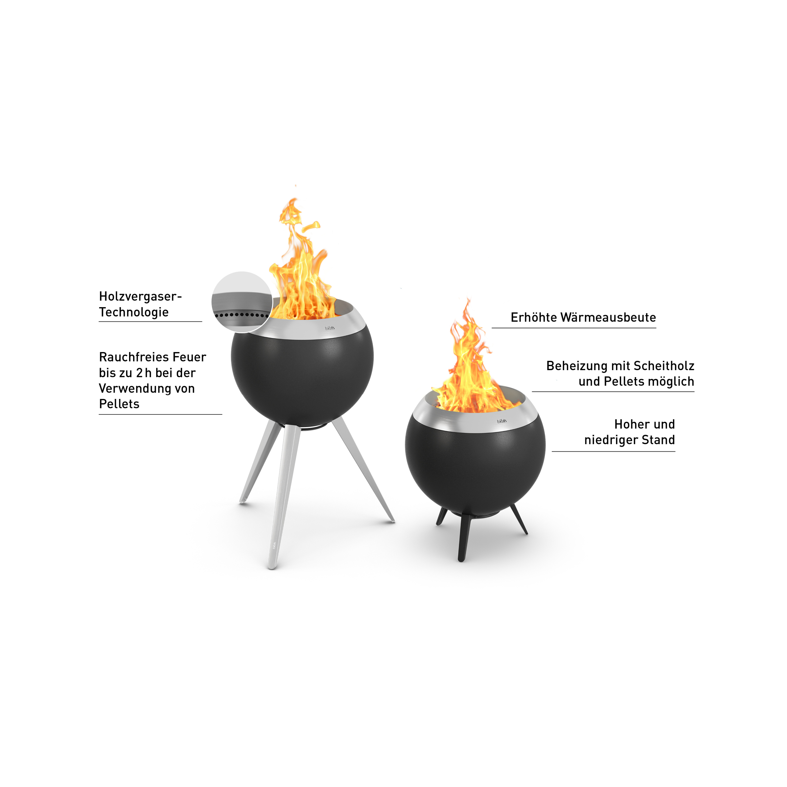 Der schwarze Mond der Feuerkunst bezaubert mit seiner Holzvergaser-Brennertechnologie, die ein atemberaubend raucharmes Feuer zündet und ein begeisterndes Flammspiel entstehen lässt. Die schwarze Stahlkugel steht sicher auf ihrem niedrigen Gussfuß und bietet beste Sicht auf das lodernde Feuer, das bei Verwendung von Pellets bis zu 2 Stunden ununterbrochen und ohne Nachlegen weiterbrennt. Die Flammen aus der primären und sekundären Verbrennung vereinen sich direkt unter der Öffnung zu einer wärmenden Einheit und machen MOON 45 auf dem niedrigen Fuß zum idealen Loungebegleiter, auch in urbanen Umgebung.