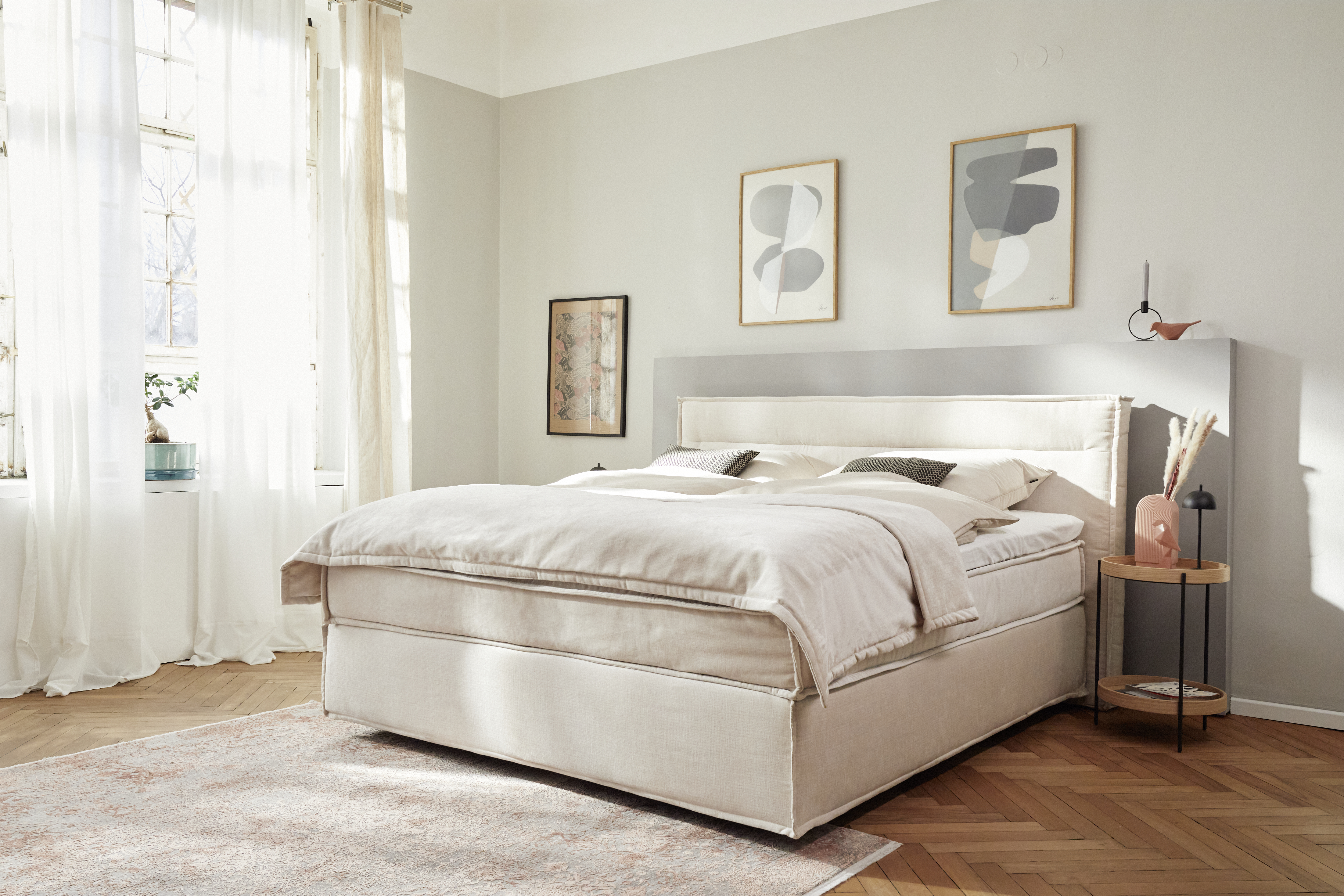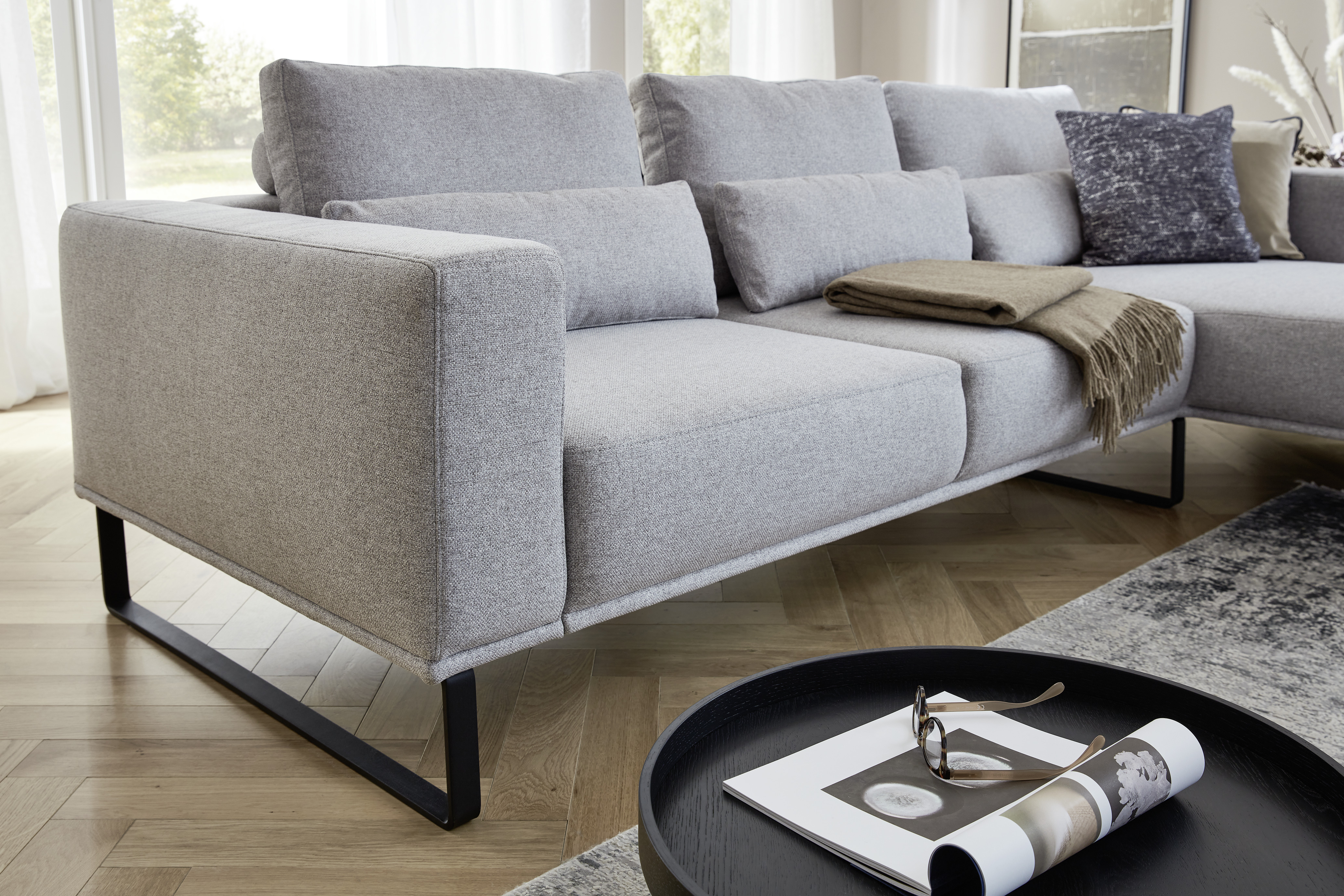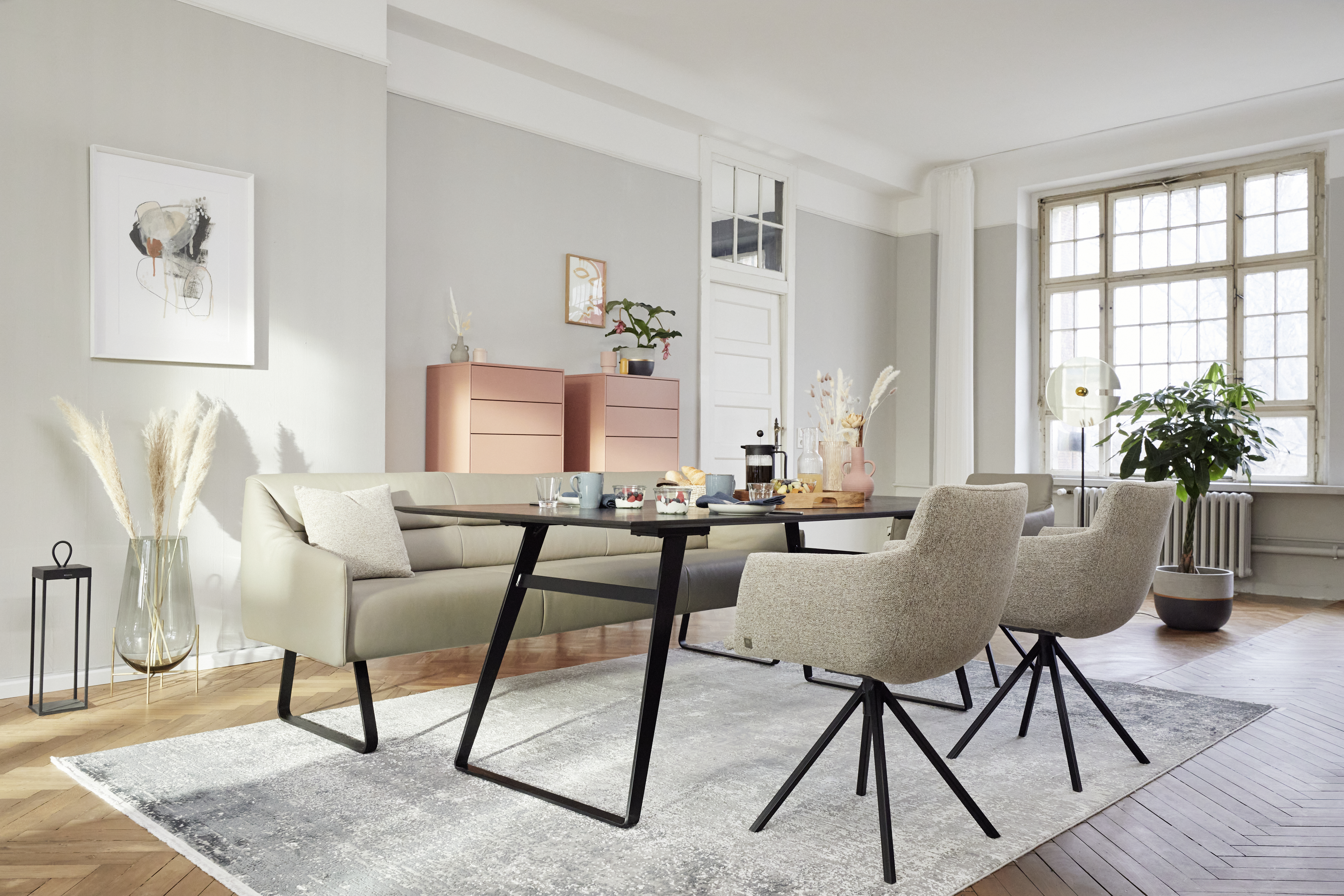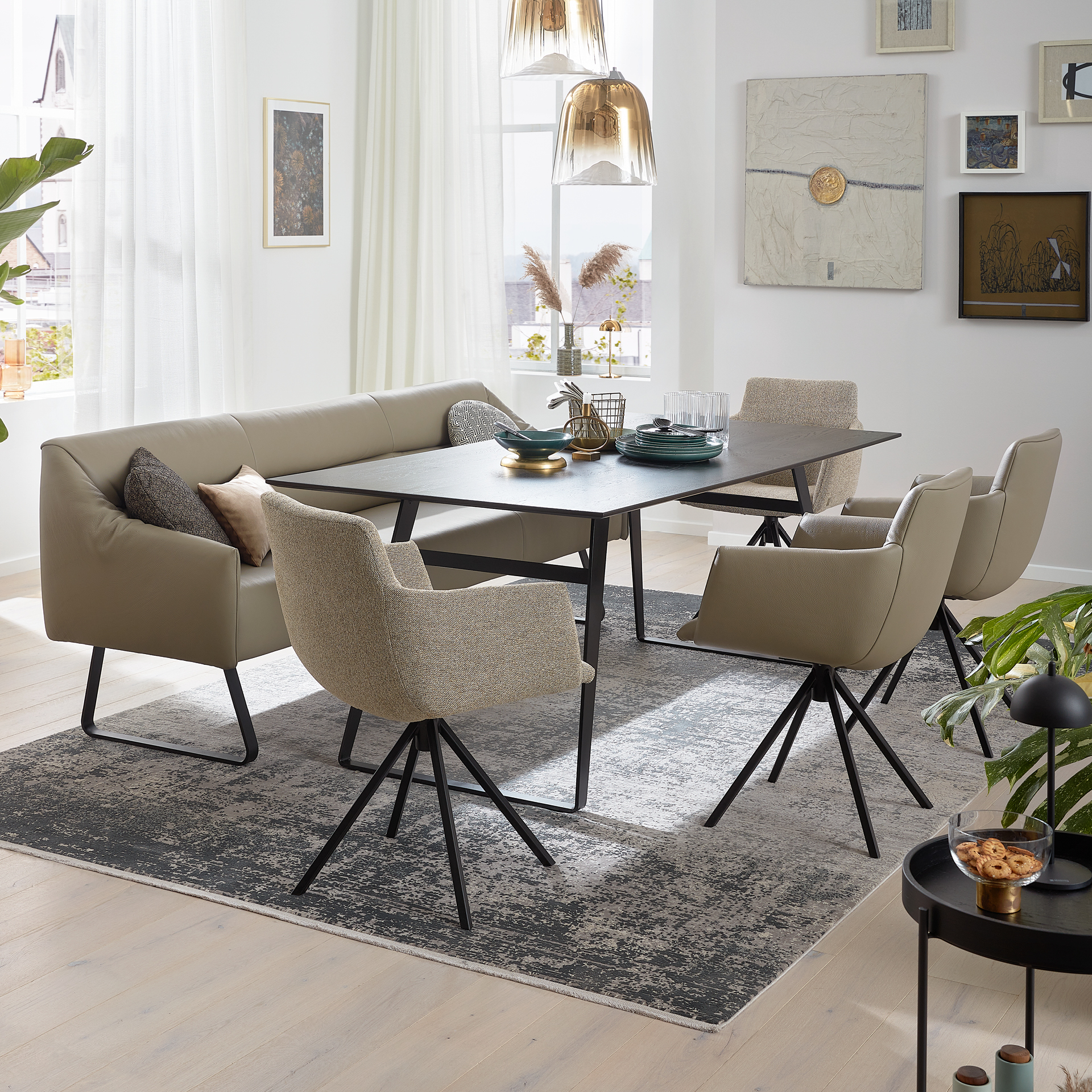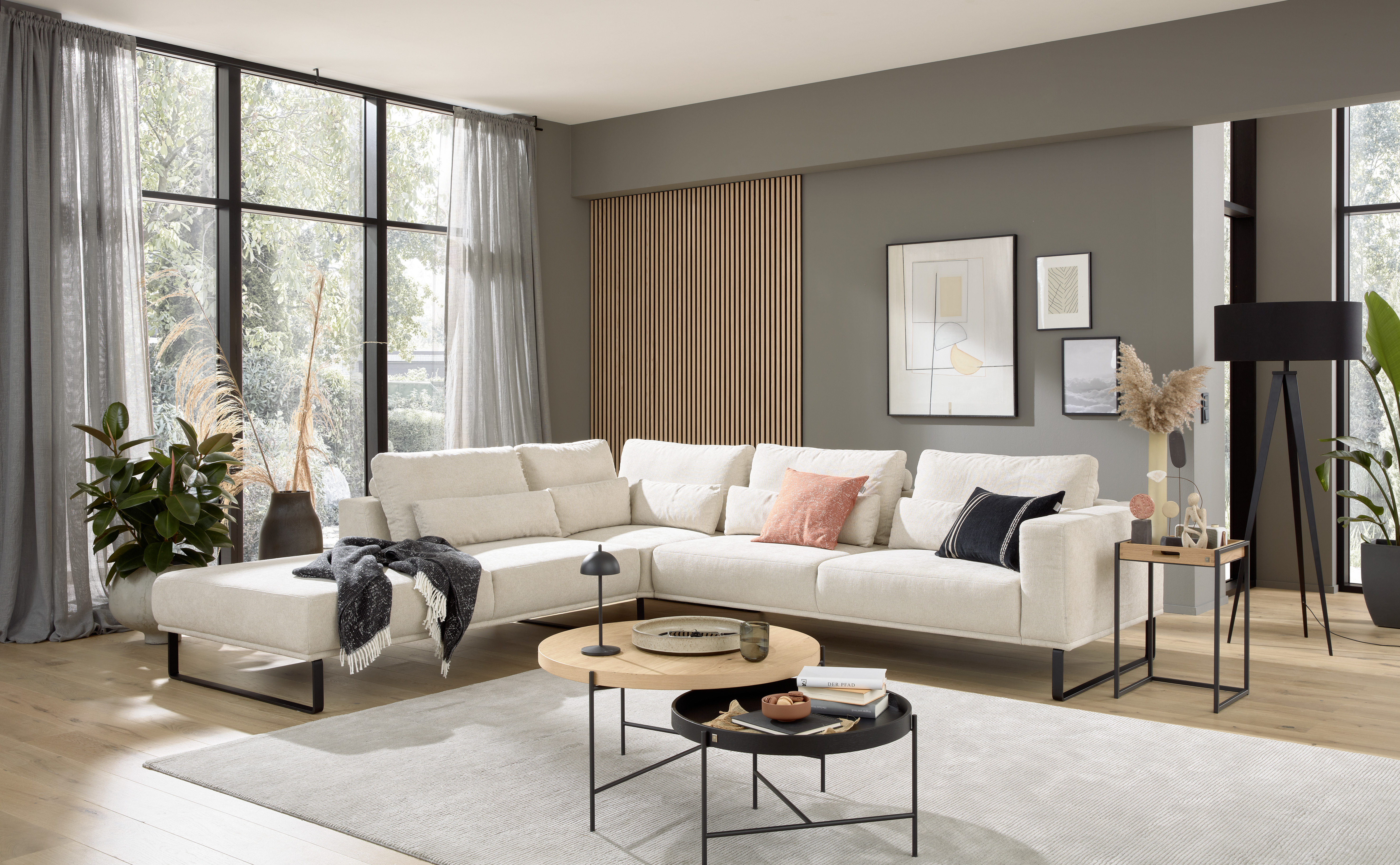 Die Kollektion umfasst ein Modulsofa, ein Esszimmerprogramm, je eine Polster- und Boxspringbettvariante, Teppiche sowie verschiedene Couch- und Beistelltische.