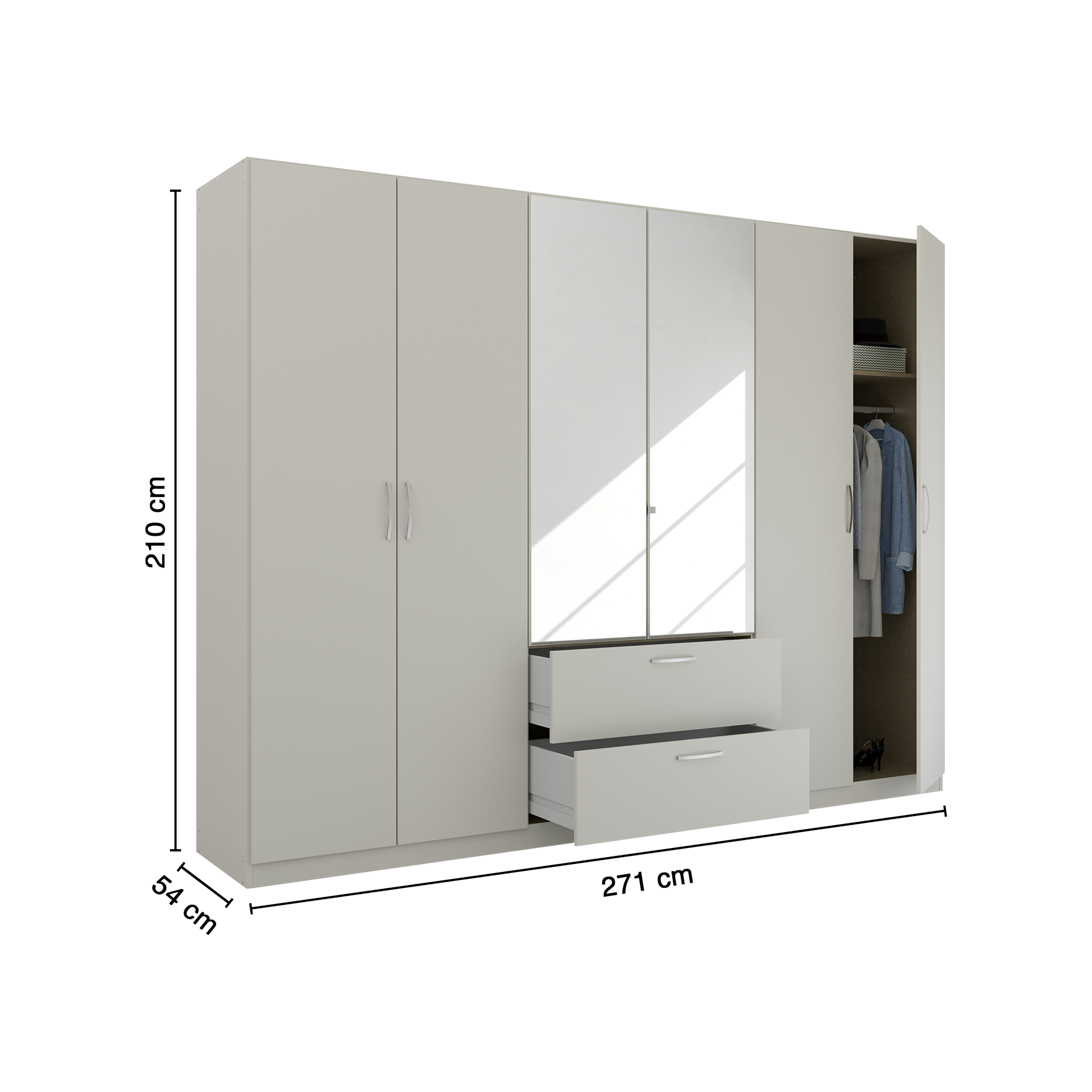 Aufstellmaß Breite: 271 cm Farbbezeichnung Korpus: Seidengrau Schubkasten: Nein