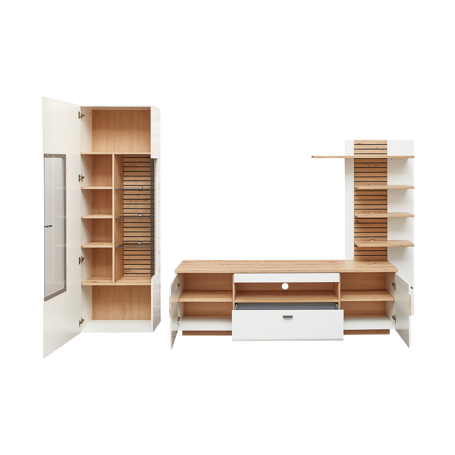 Hartmann Wohnwand Caya mit Beleuchtungspaket Korpus Kerneiche Umato Front Weißglas matt