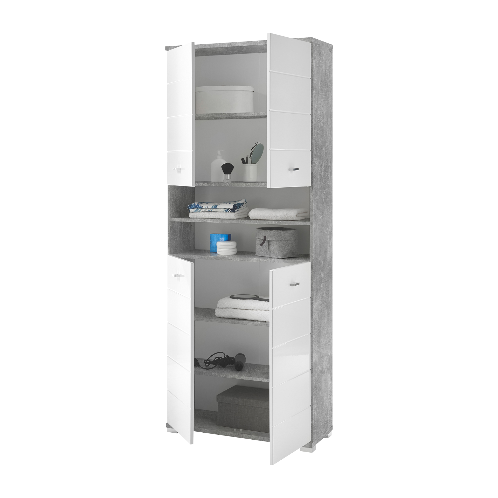 Der Badschrank Modell Polly vereint stilvolles Design und praktische Funktionalität. Die Front in glänzendem Weiß und der Korpus in elegantem Grau schaffen eine harmonische und moderne Optik. Beide Elemente bestehen aus hochwertigem Holzwerkstoff, was für Langlebigkeit und Stabilität sorgt.