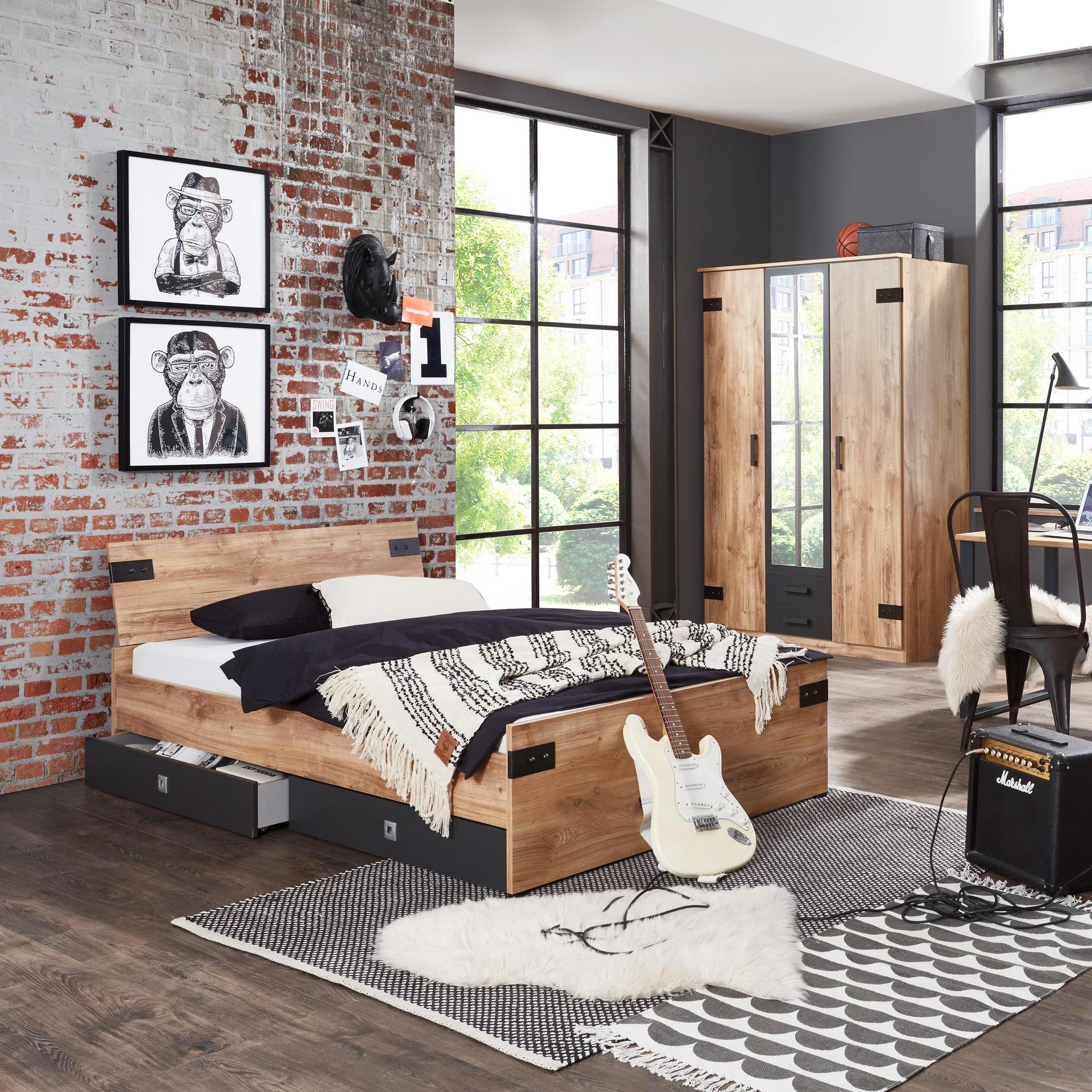 - 1x Bett Libero Absetzung Graphit Korpus Plankeneiche Nachbildung 140x200 cm (210409-01)