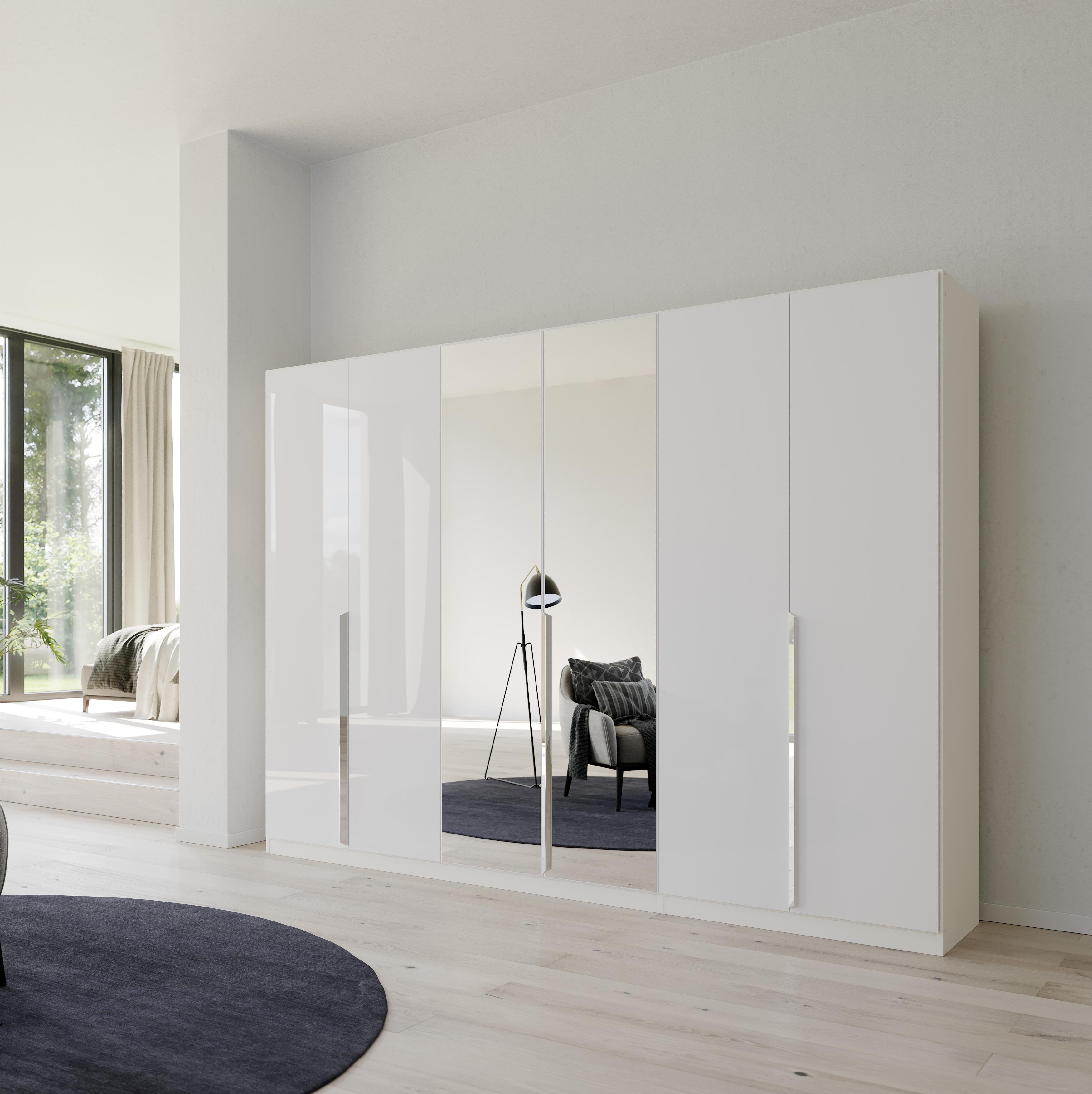 Der Drehtürenschrank Glam überzeugt durch sein elegantes Design und hochwertige Materialien. Der Korpus in strahlendem Weiß und die silberfarbenen Griffe verleihen dem Schrank eine moderne Ästhetik. Die Front aus Spiegelglas und das Hochglanz Dekor sorgen für eine luxuriöse Optik und lassen jeden Raum größer wirken.