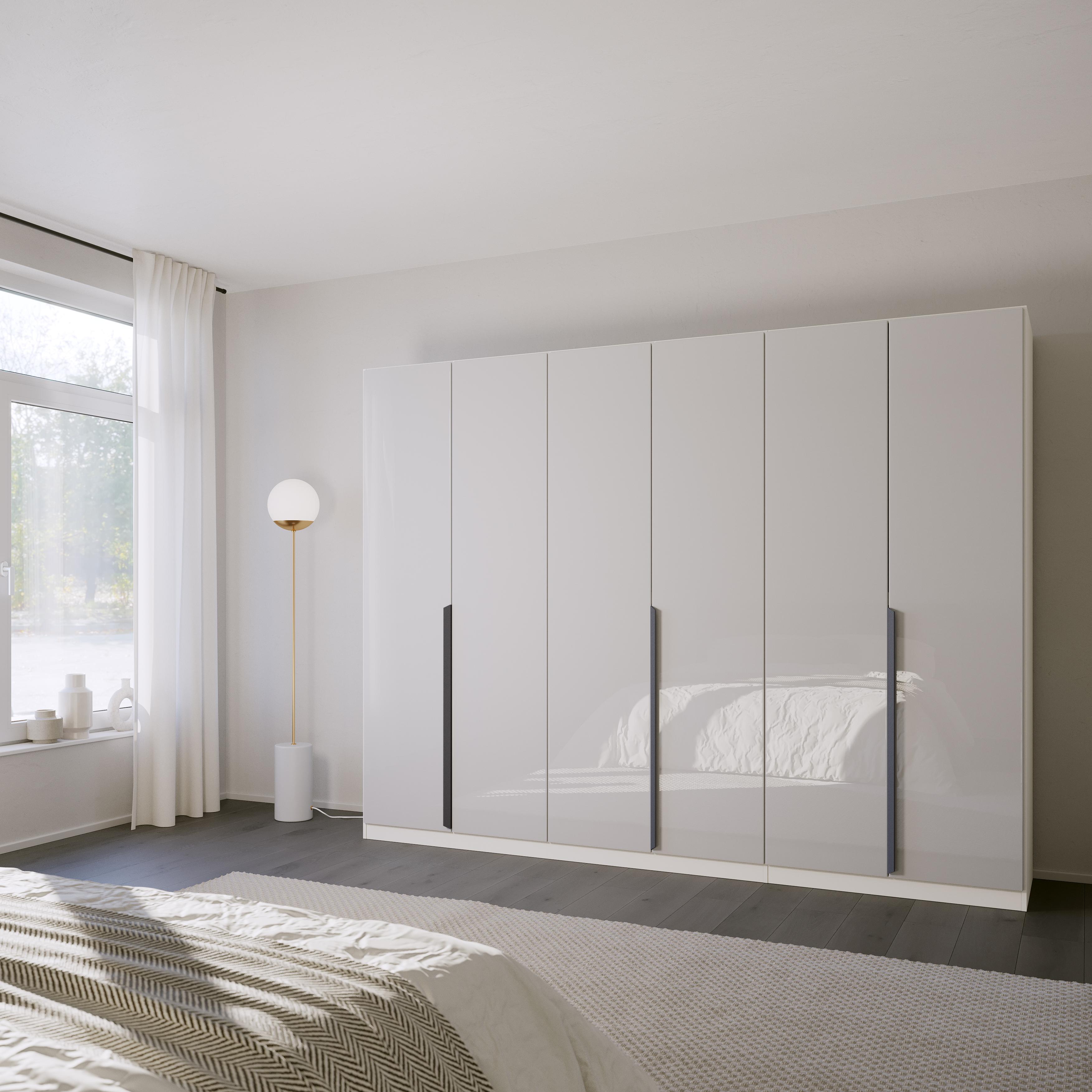 Der Drehtürenschrank Mood bietet eine stilvolle und funktionale Lösung für jedes Schlafzimmer. Die Fronten in elegantem Grau aus hochwertigem Glas harmonieren perfekt mit den grauen Griffen und dem mattweißen Korpus aus robustem Holzwerkstoff. Der Schubkasten ist ein praktisches Hauptmerkmal, das zusätzlichen Stauraum bietet und für Ordnung sorgt.