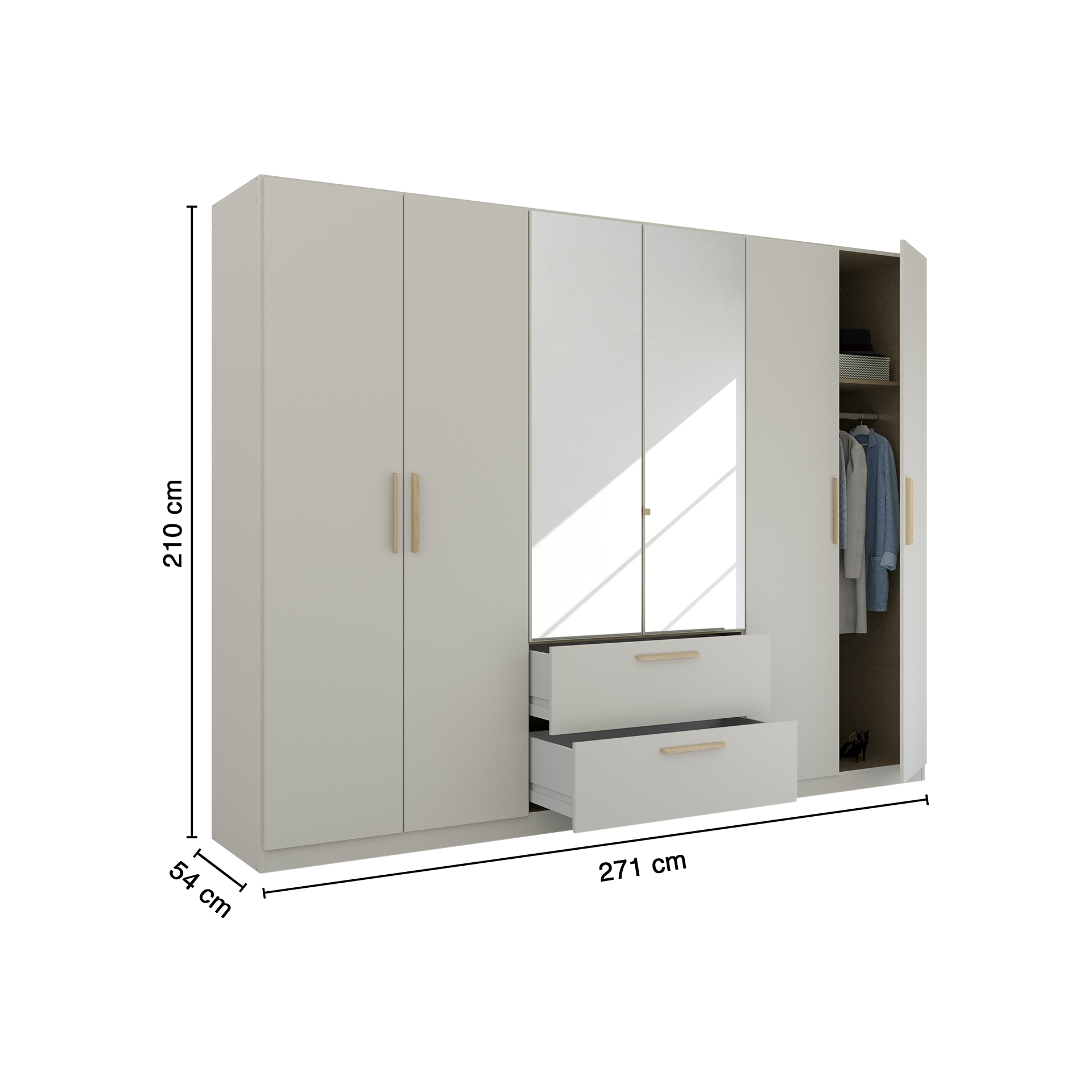 Der Drehtürenschrank Sky vereint Funktionalität und elegantes Design. Der Korpus in stilvollem Grau mit einer mattierten Oberfläche harmoniert perfekt mit den Holzfarbenen Griffen aus Wild Eiche. Die Fronten aus Spiegelglas verleihen dem Schrank eine moderne und zugleich zeitlose Ästhetik.