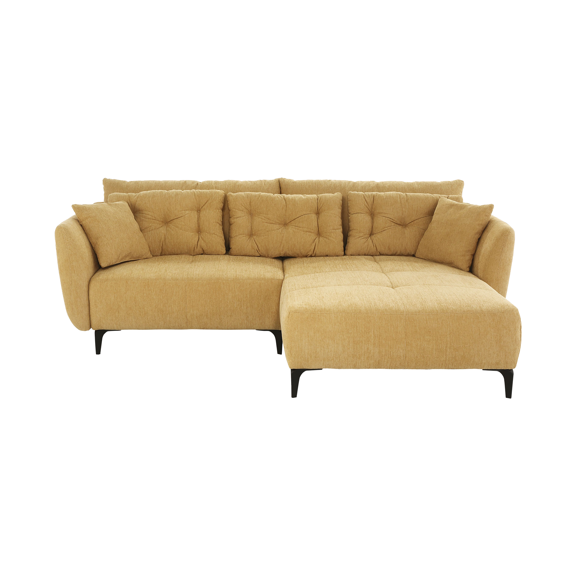 Das Modell Janek ist ein stilvolles Ecksofa, das sowohl durch seine Optik als auch durch seinen Komfort überzeugt. Der Bezug besteht aus hochwertigem Polyester in einem lebhaften Gelbton, das Ihrem Wohnraum eine frische und einladende Atmosphäre verleiht. Das Gewebe aus Chenille unterstreicht die luxuriöse Haptik und sorgt für ein angenehmes Sitzgefühl.