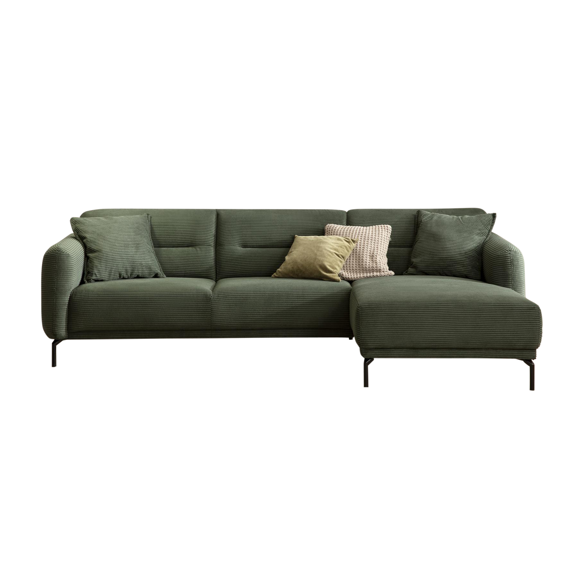 Entdecken Sie das Ecksofa Noya in elegantem Grün, das Ihrem Wohnraum eine stilvolle Note verleiht. Gefertigt aus hochwertigem Polyester, vereint dieses Modell Langlebigkeit und Komfort. Die großzügige Sitzhöhe von 46 cm und die Sitztiefe von 53 cm sorgen für ein entspanntes Sitzgefühl, während die Polsterung aus Schaum und Wellenunterfederung optimalen Sitzkomfort garantiert.