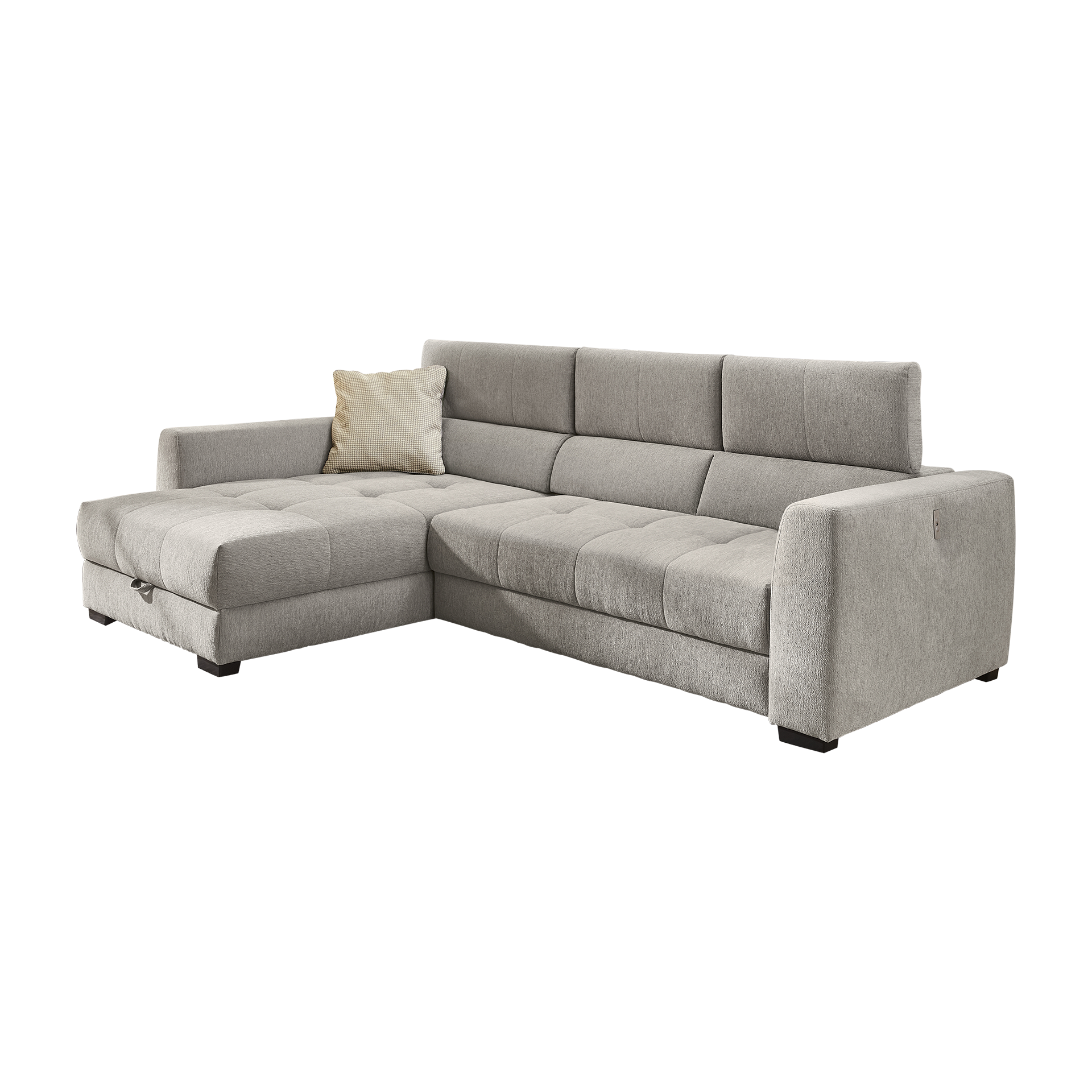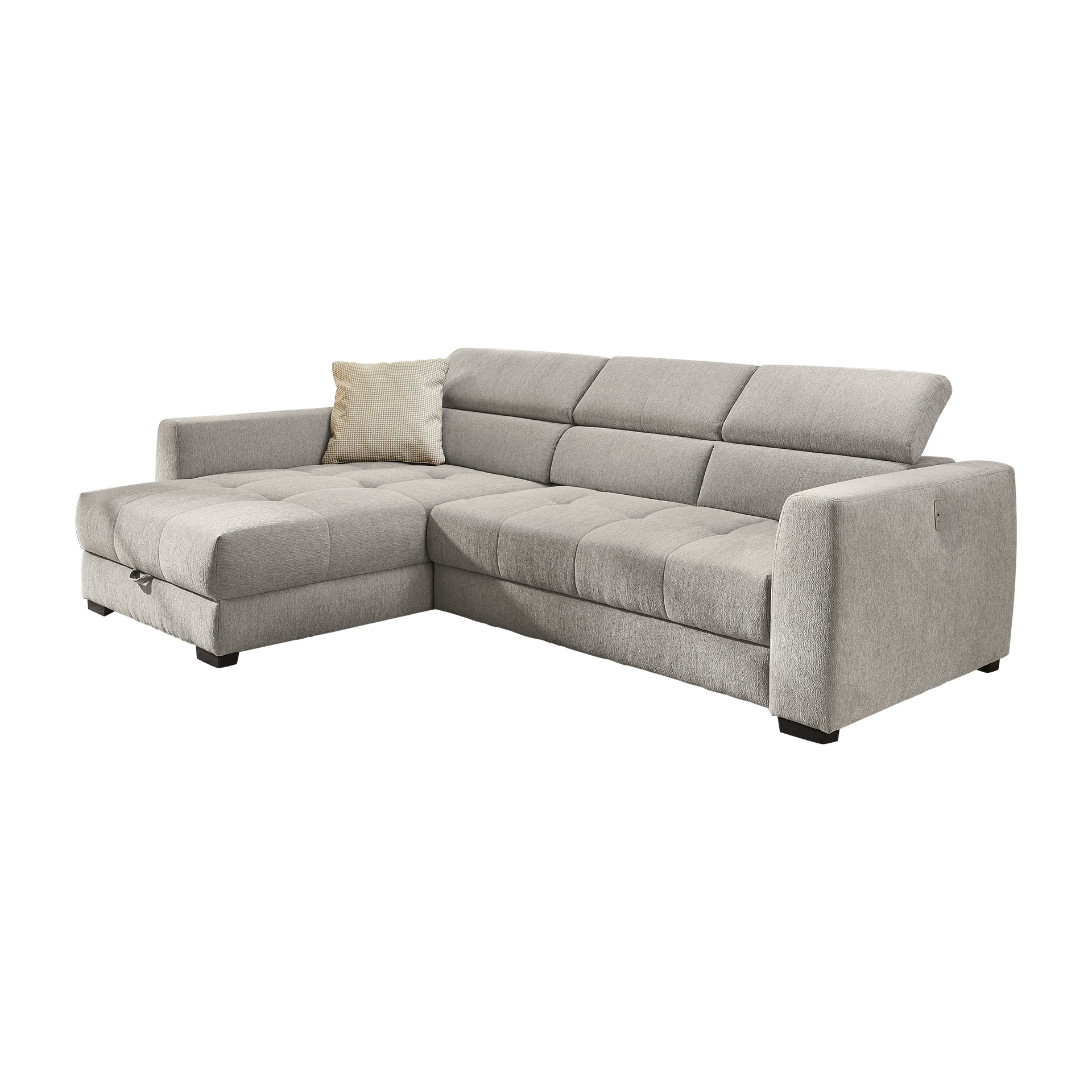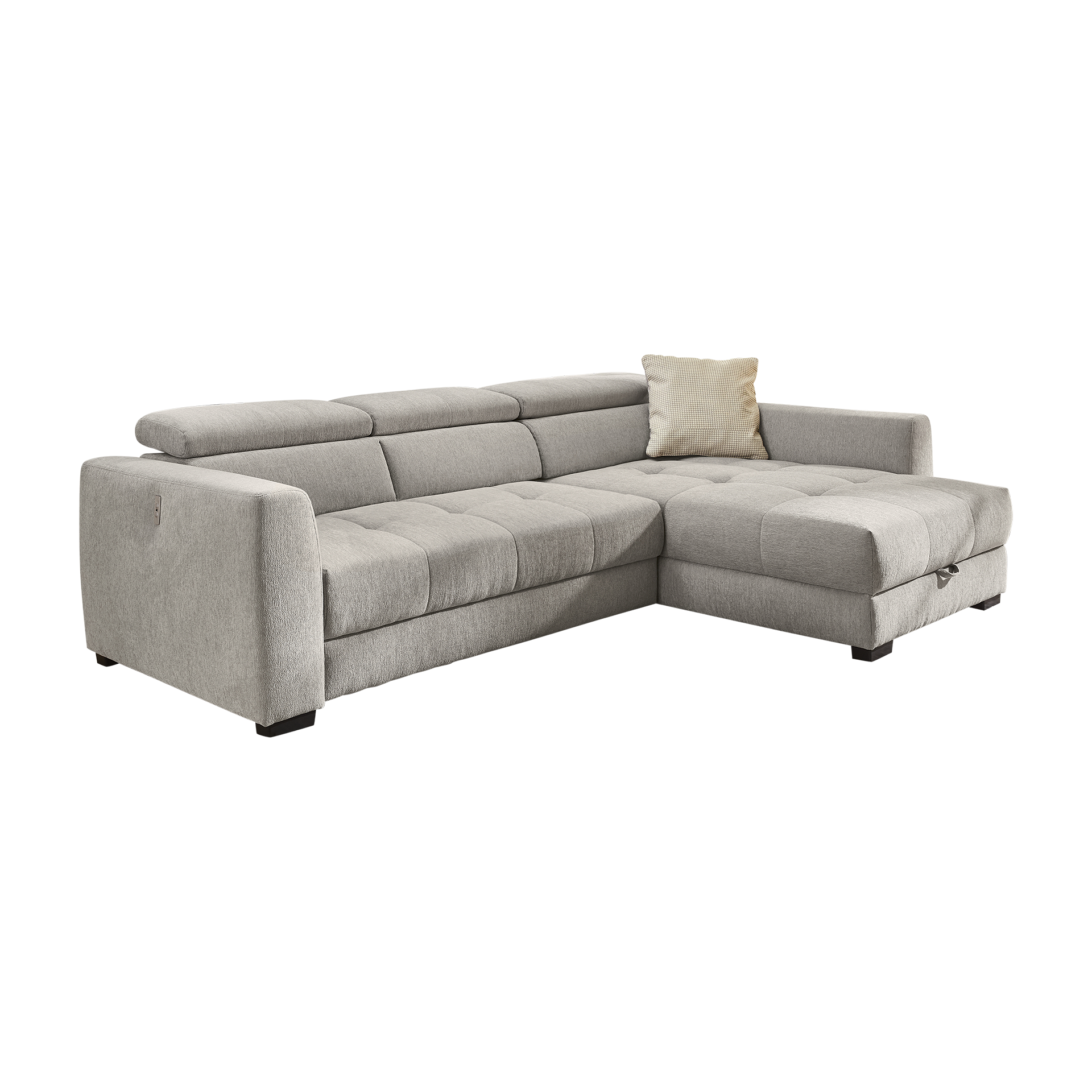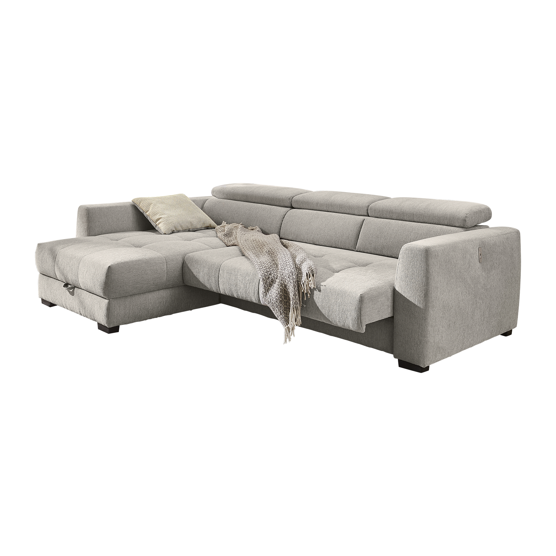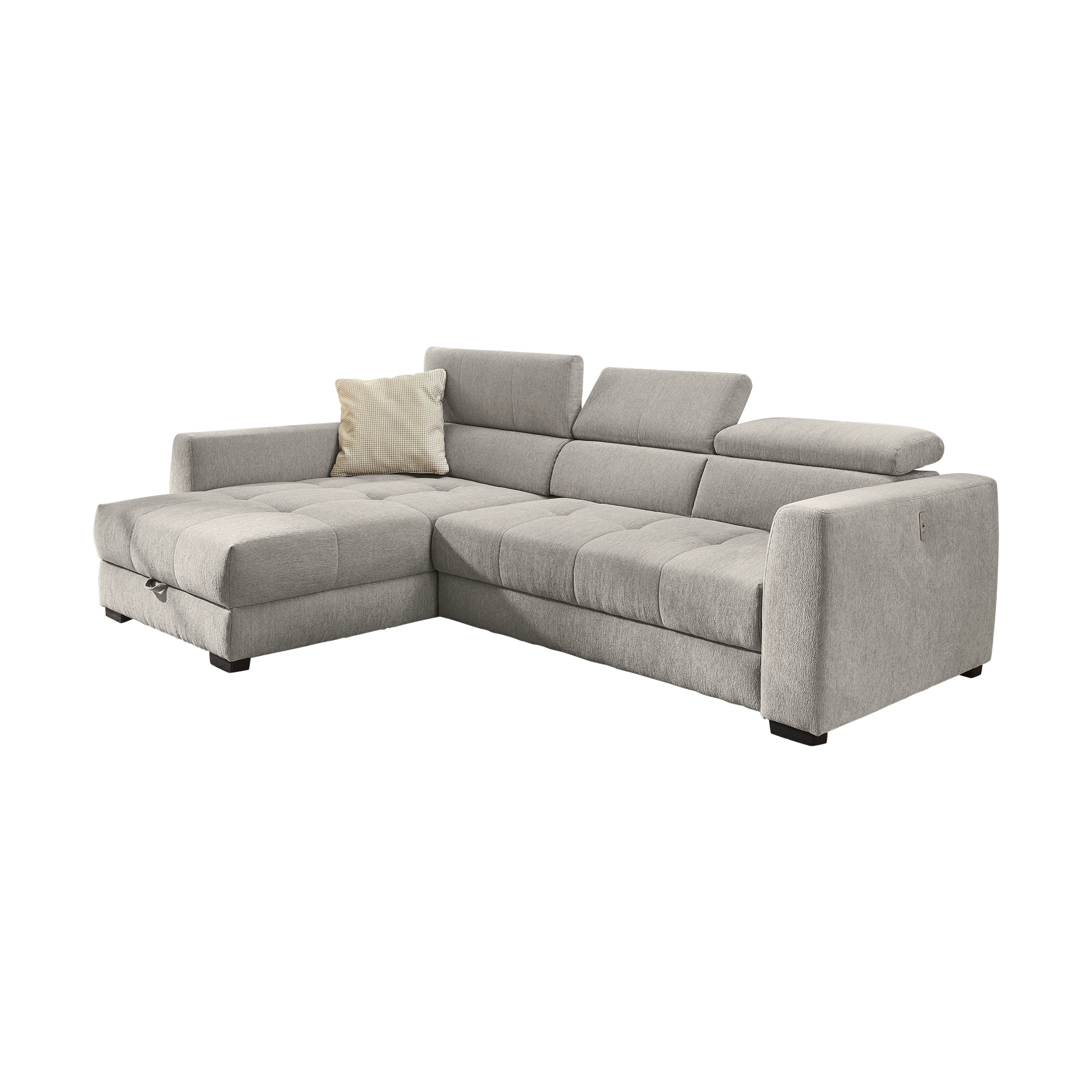 Das Ecksofa San Marino vereint stilvolles Design und funktionalen Komfort in einem Möbelstück. Der Bezug in elegantem Grau besteht aus hochwertigem Polyester, das Langlebigkeit und Pflegeleichtigkeit verspricht. Die Nosagunterfederung sorgt für optimalen Sitzkomfort und unterstützt eine entspannte Haltung. Die verstellbare Kopfstütze bietet zusätzlichen Komfort und lädt zum Verweilen ein.