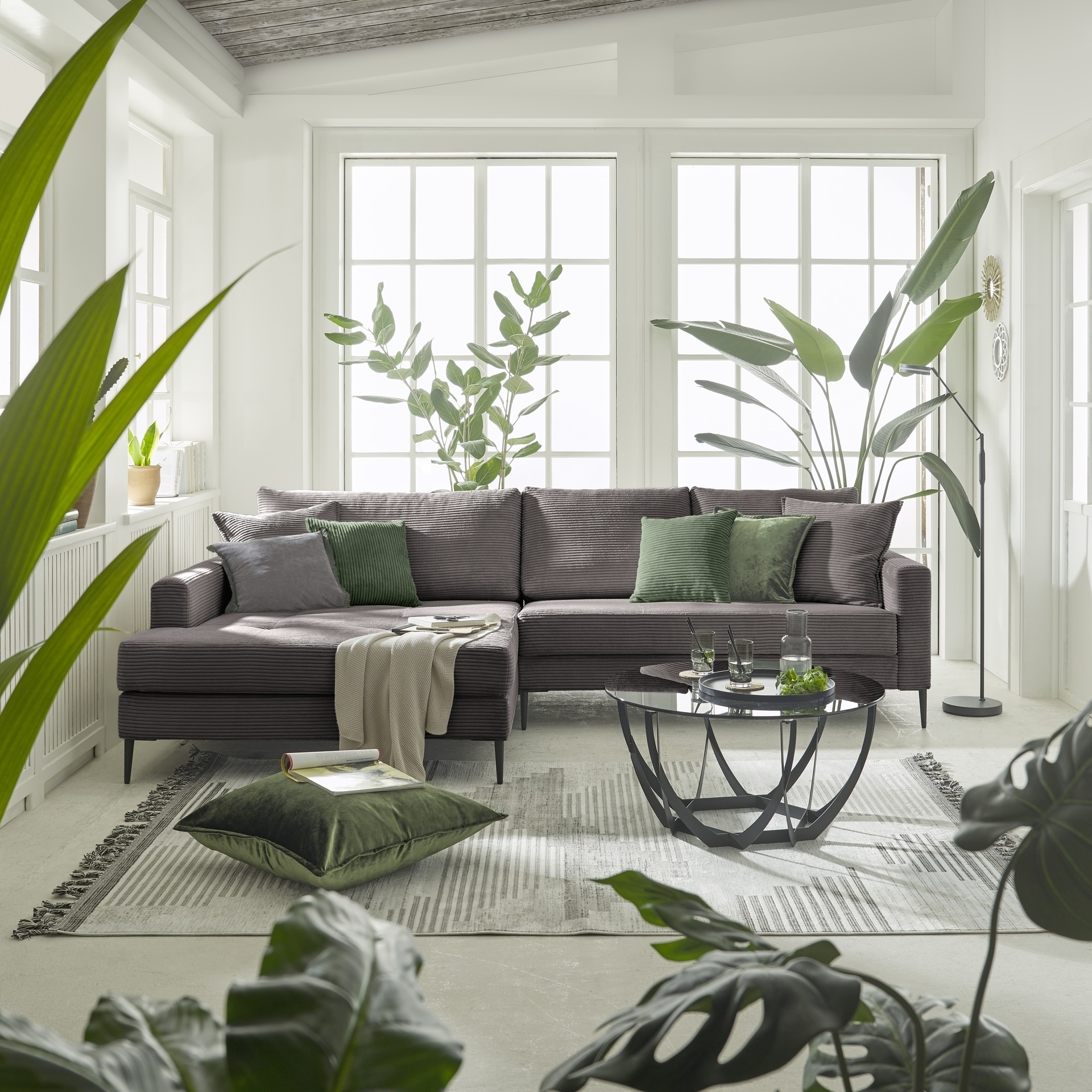 Der Bezug in der Farbe Graphit besteht aus strapazierfähigem Polyester und ist in einer Cord-Gewebeart gefertigt, was dem Sofa eine besondere Haptik und Optik verleiht. Der Rücken des Sofas ist komplett echt, was zusätzlichen Komfort und eine einheitliche Ästhetik bietet.