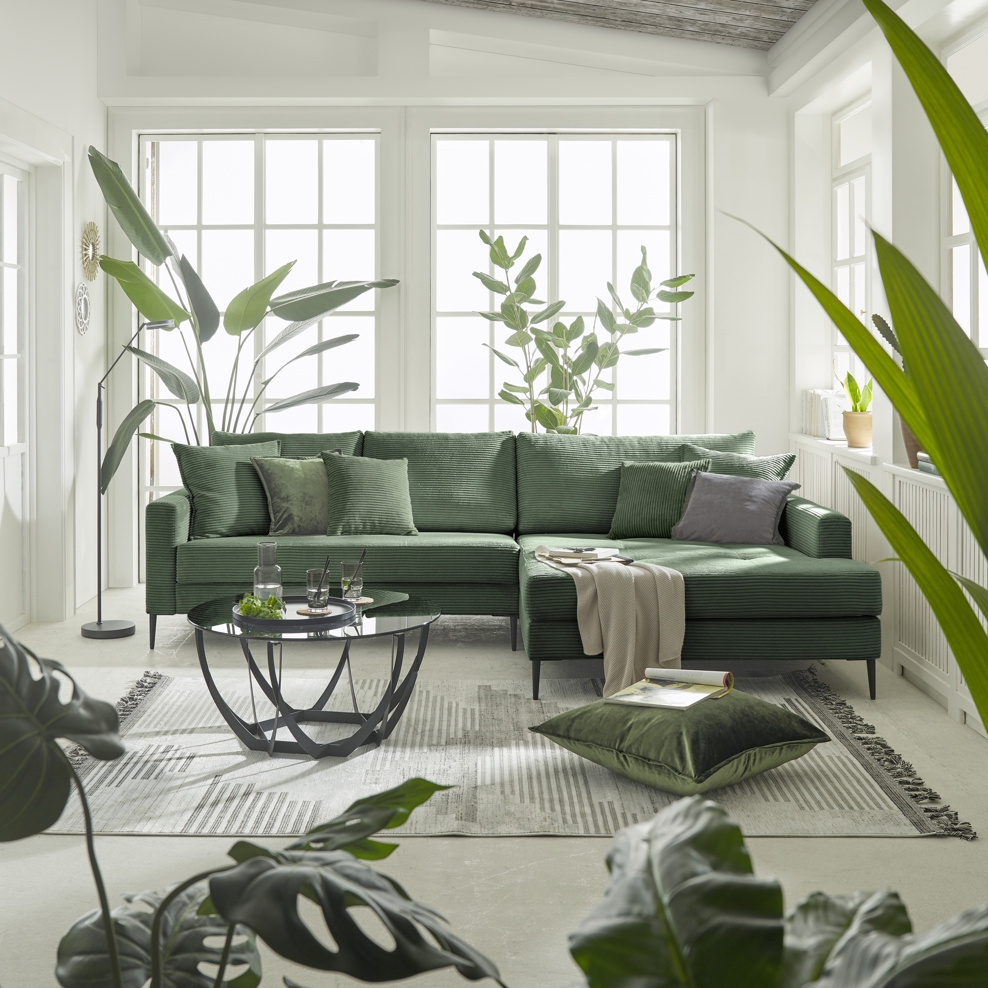 Erleben Sie Komfort und Stil mit dem Ecksofa Modell Sunset. Dieses Sofa bietet eine Sitzhöhe von 43 cm und eine Sitztiefe von 60 cm, ideal für entspannte Stunden. Der grüne Cordstoffbezug besteht aus hochwertigem Polyester und sorgt für ein angenehmes Sitzgefühl. Die Wellenunterfederung trägt zusätzlich zum hohen Sitzkomfort bei.
