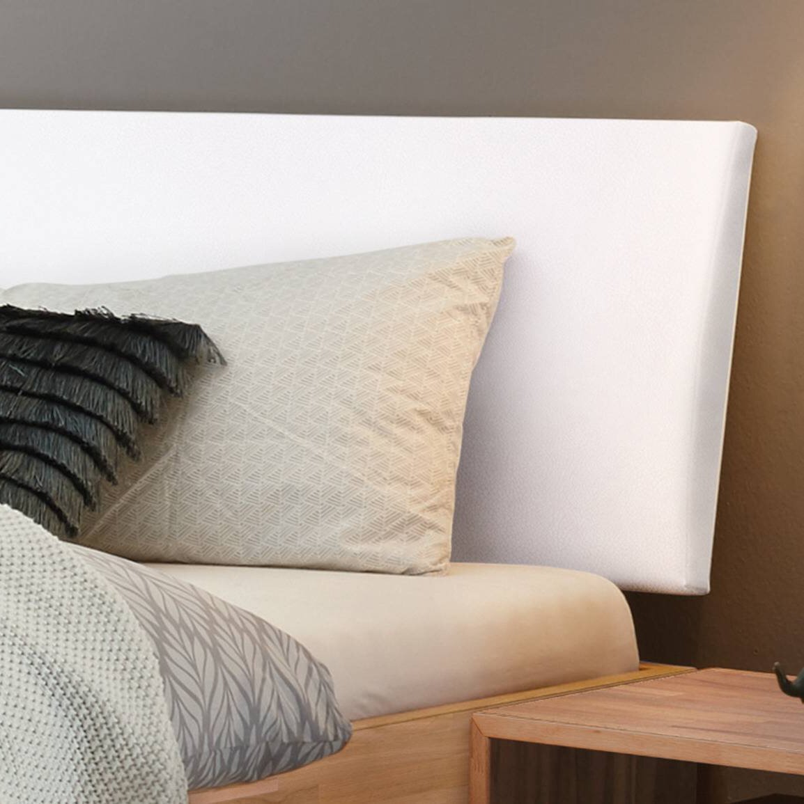 Das Kopfteil aus Kunstleder in klassischem Weiß setzt einen stilvollen Akzent und besteht aus einer Materialmischung von Baumwolle und Polyester, die für Komfort und Langlebigkeit sorgt. Die Höhe der Füße beträgt 20 cm, was eine angenehme Einstiegshöhe bietet.
