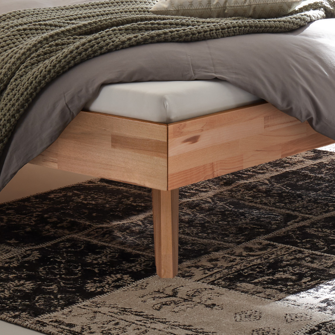 Die stabilen Holzfüße, ebenfalls in Buche gehalten, bieten mit einer Höhe von 20 cm eine ideale Unterstützung und fügen sich harmonisch in das Gesamtbild ein. Dank der robusten Materialien und der sorgfältigen Verarbeitung garantiert dieses Bett Langlebigkeit und Stabilität.