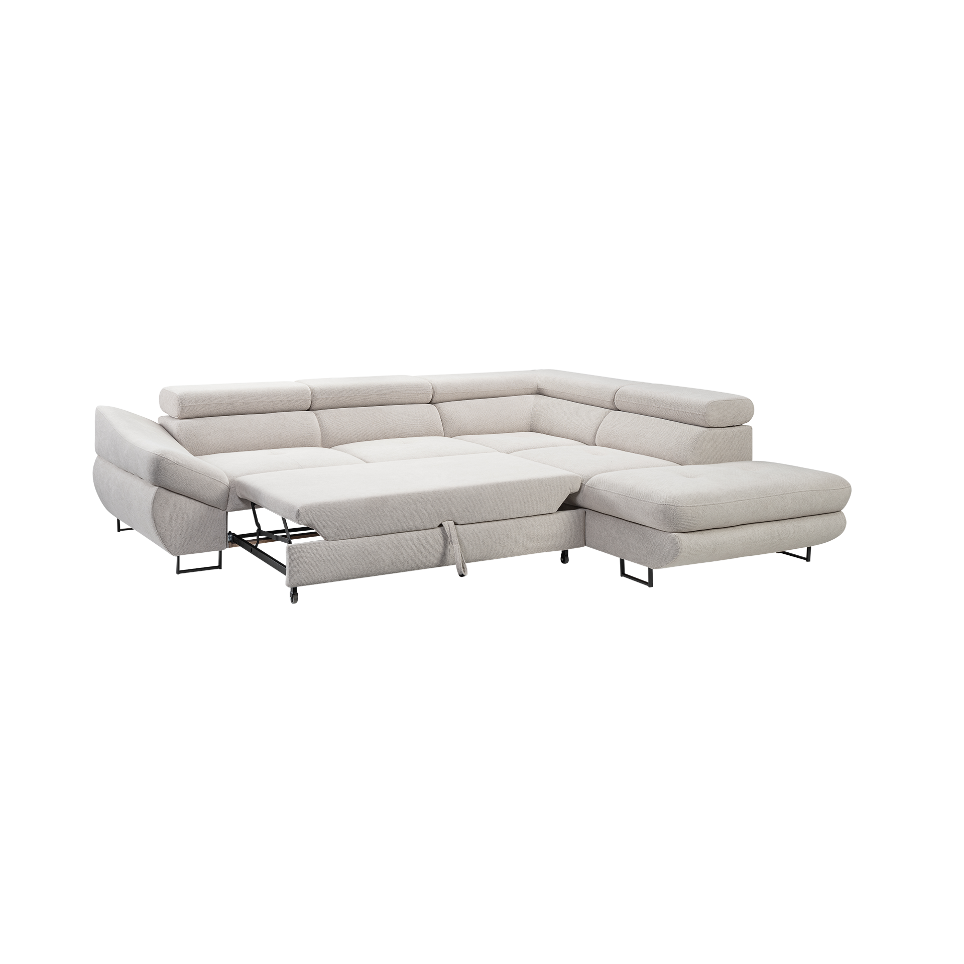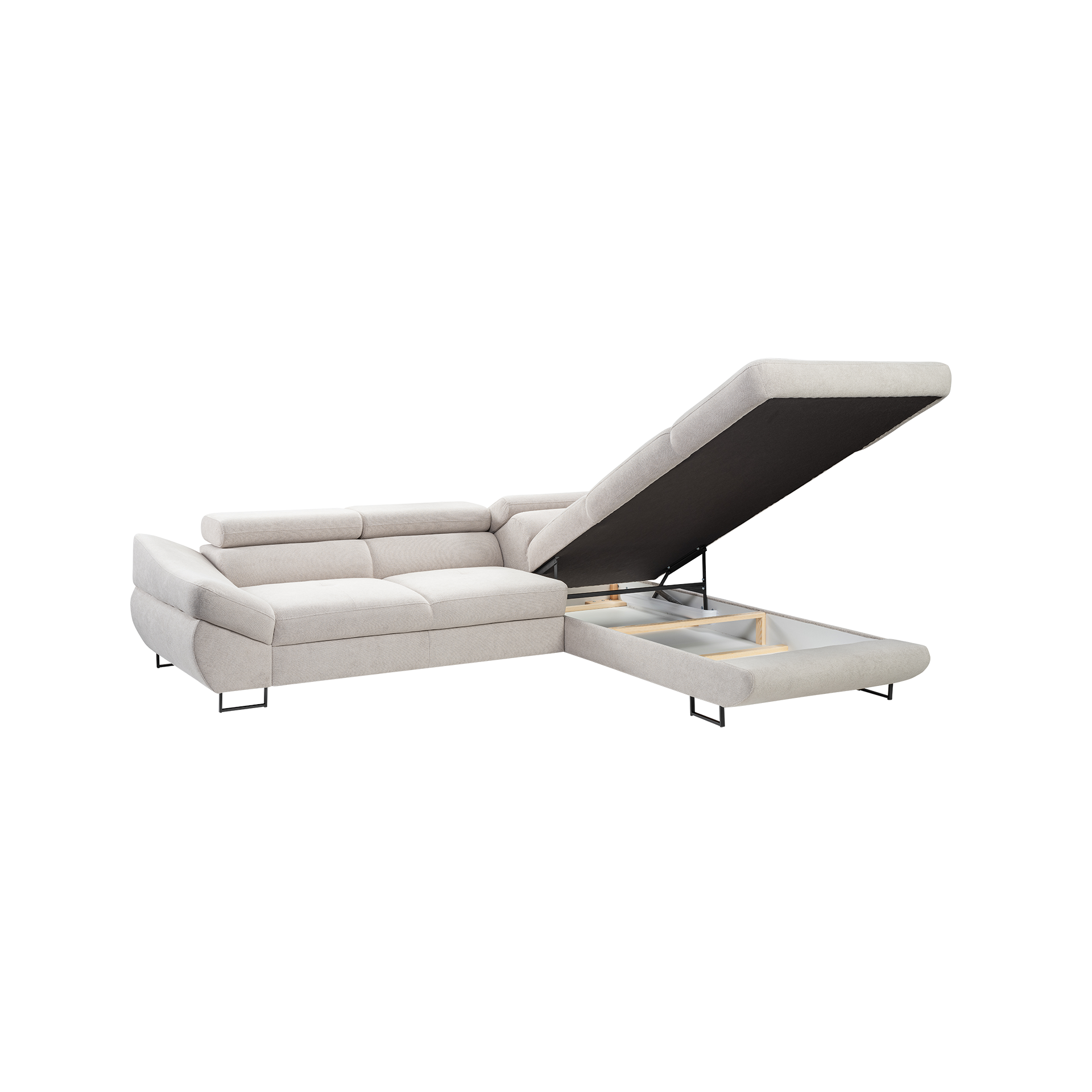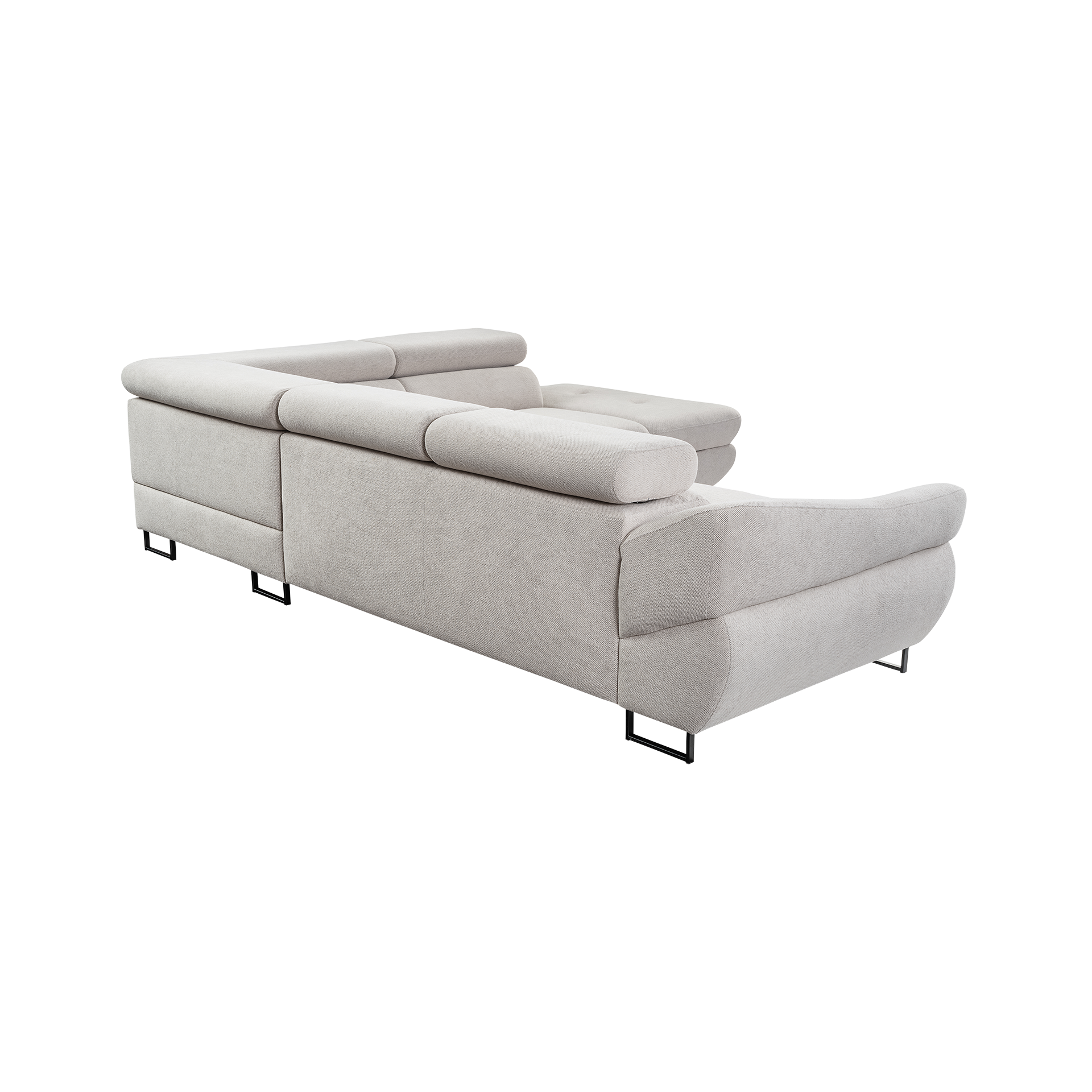 Dieses Ecksofa ist mit einer Schlaffunktion ausgestattet, die sich mühelos in ein bequemes Bett verwandeln lässt. Ein integrierter Bettkasten bietet zusätzlichen Stauraum für Bettwäsche und Kissen. Die Kopfteilverstellung ermöglicht Ihnen, die perfekte Sitz- oder Liegeposition zu finden, während die echte Rückenpolsterung für optimalen Komfort sorgt.