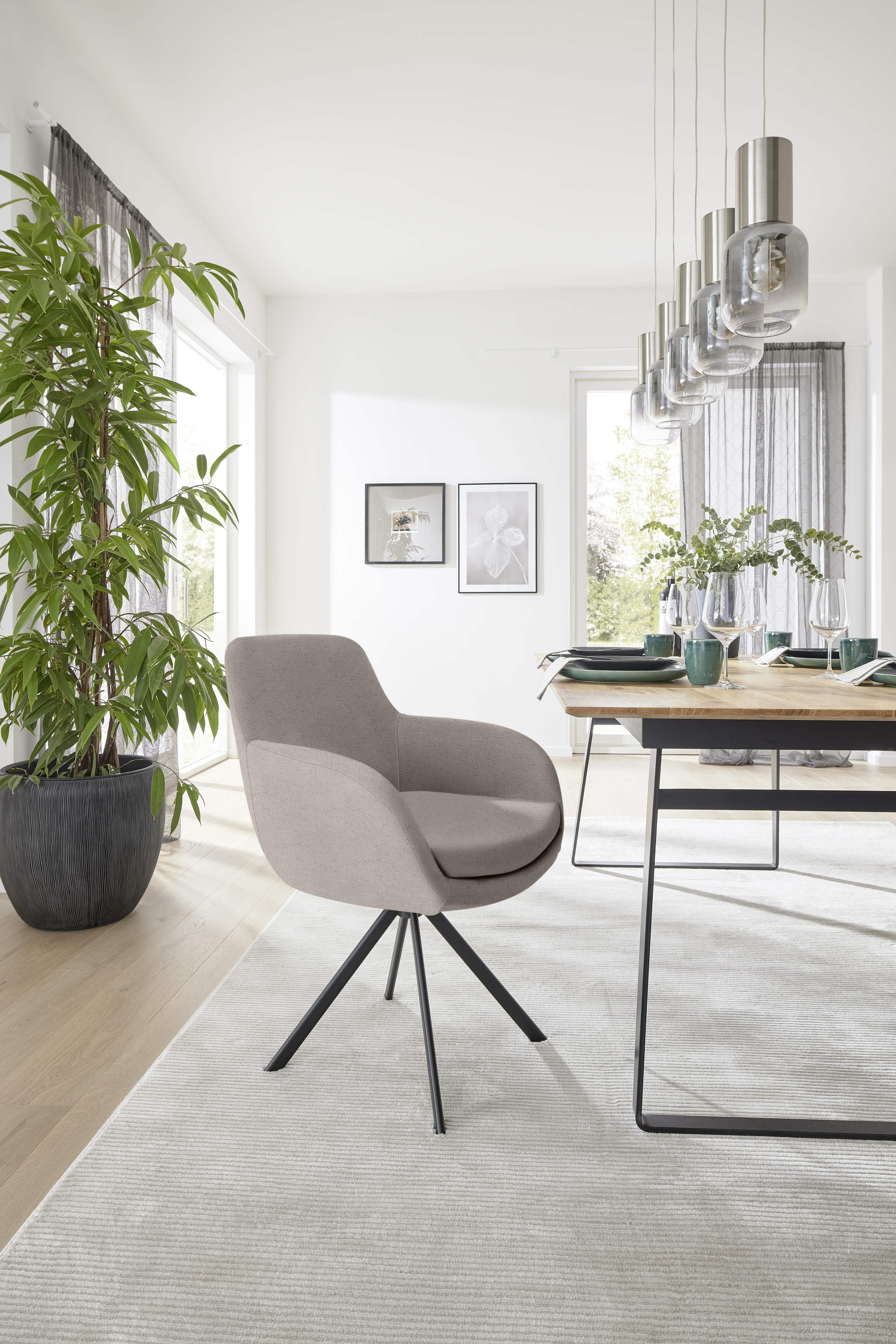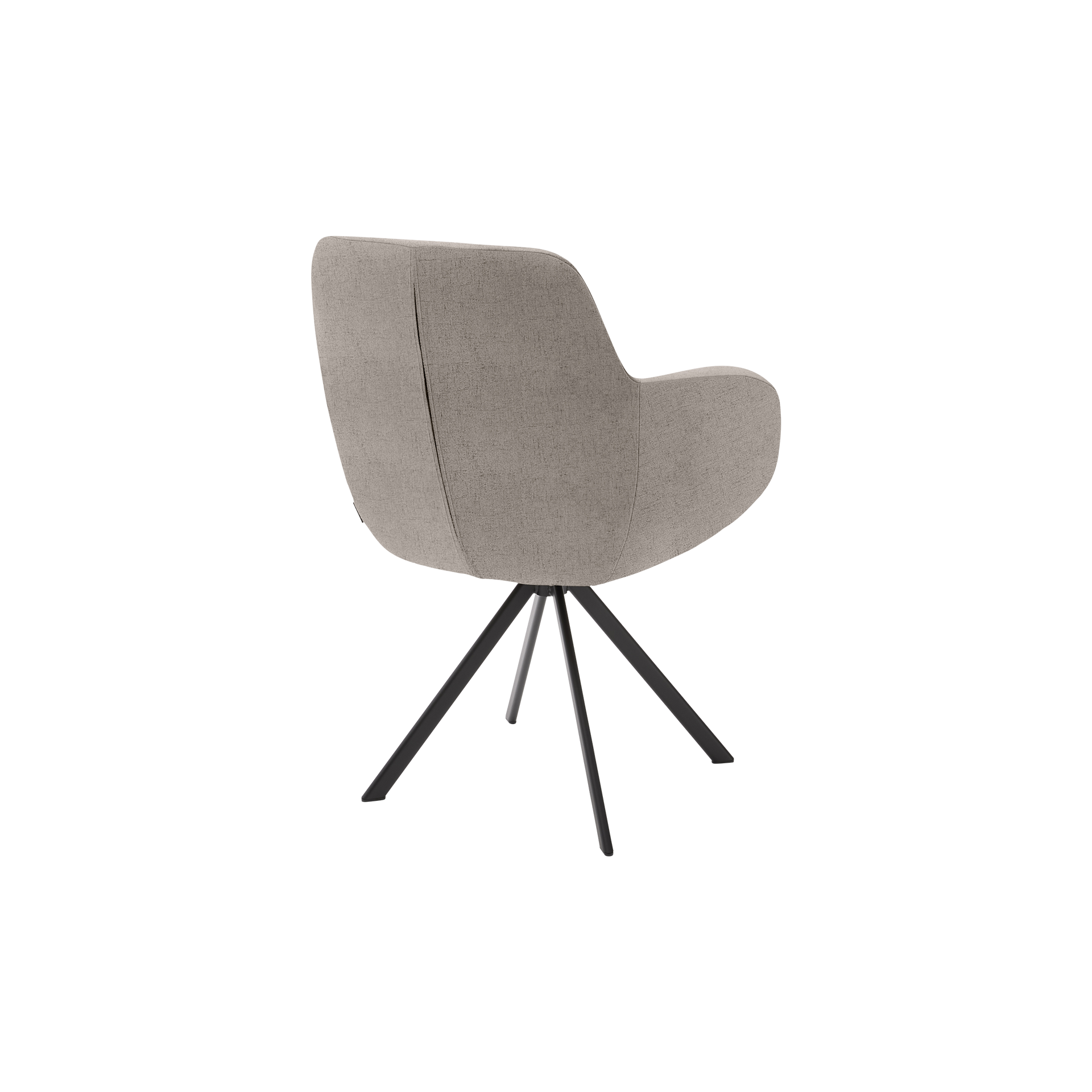 Ein besonderes Highlight ist die drehbare Sitzfläche mit automatischer Rückstellung, die für zusätzlichen Komfort sorgt. Das robuste Gestell aus schwarzem Eisen verleiht dem Stuhl Stabilität und eine moderne Optik. Der Stoffbezug und das formschöne Design machen Tavia zu einem idealen Möbelstück für jedes stilbewusste Zuhause.