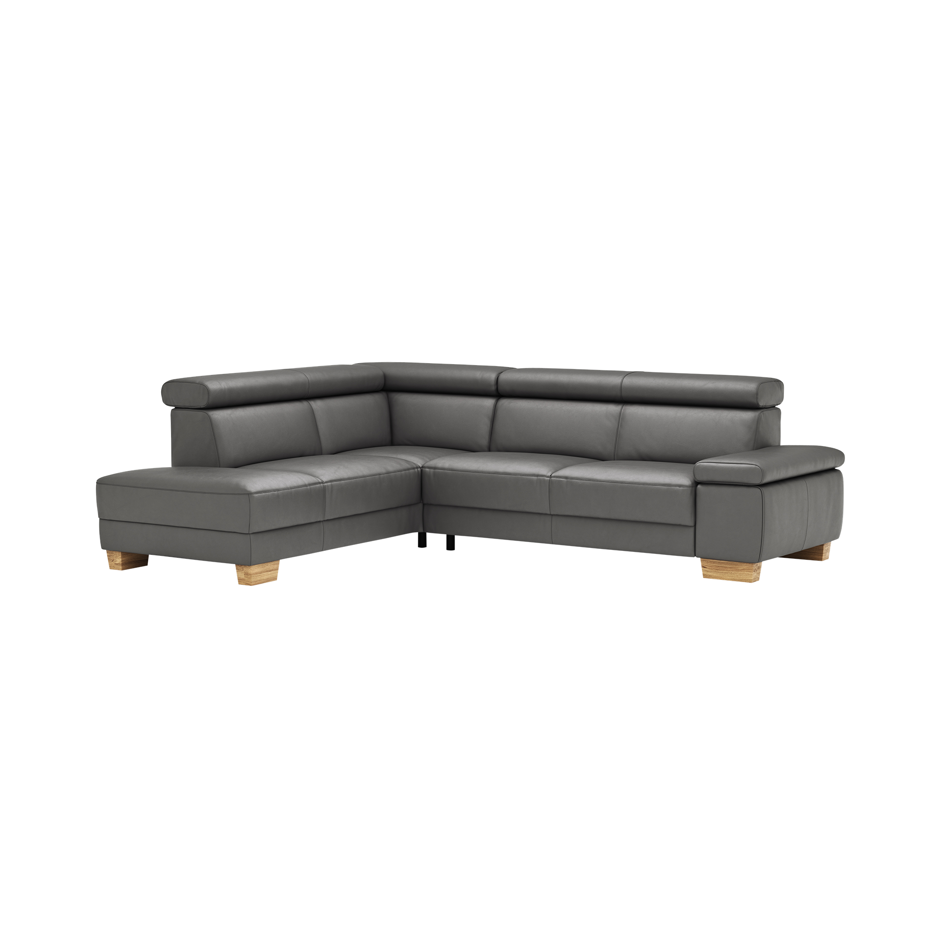 Das Ecksofa verfügt über eine praktische Kopfteilverstellung, die zusätzlichen Komfort ermöglicht. Der Bezug aus edlem Leder und die echten Rückenpolsterungen sorgen für ein luxuriöses Sitzgefühl. Die Füße aus Holz verleihen dem Sofa Stabilität und eine natürliche Ästhetik.