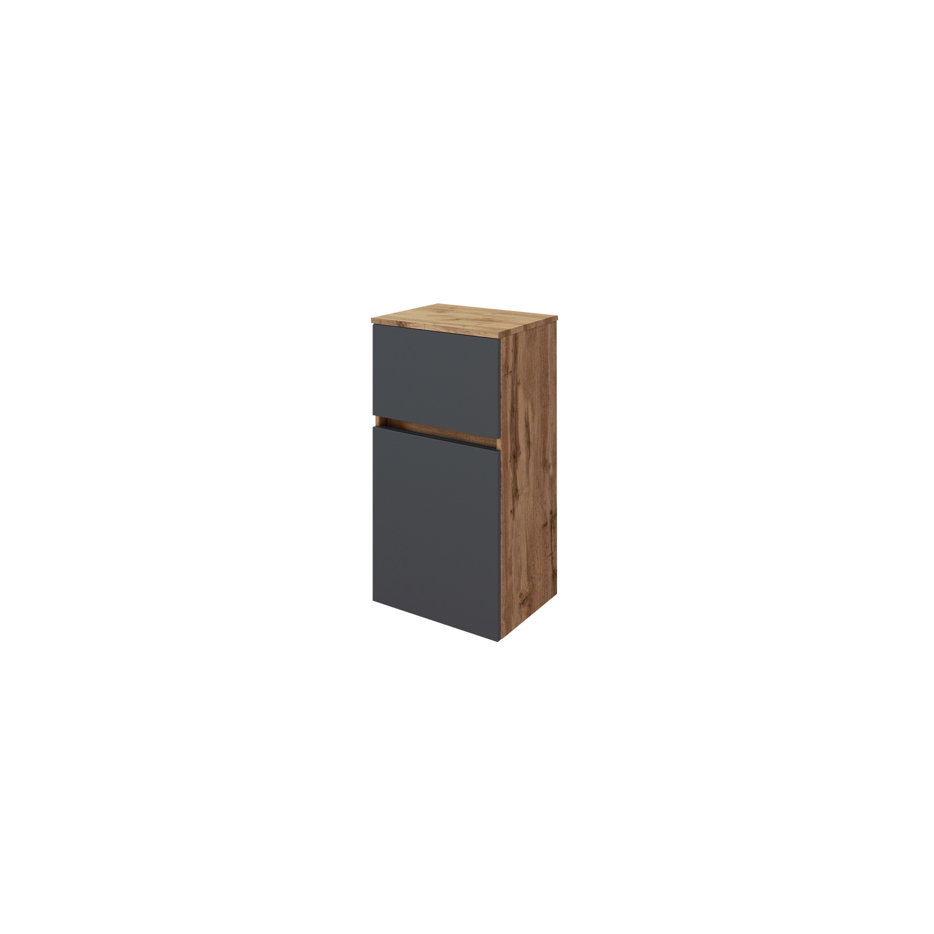 Die Front in elegantem Grau und der Korpus in ansprechendem Eiche Dekor verleihen Ihrem Badezimmer eine zeitlose Ästhetik. Beide Oberflächen sind in einer matten Beschaffenheit gehalten, was für eine ruhige und harmonische Optik sorgt. Der Badunterschrank ist aus hochwertigem Holzwerkstoff gefertigt und verspricht Langlebigkeit und Stabilität.