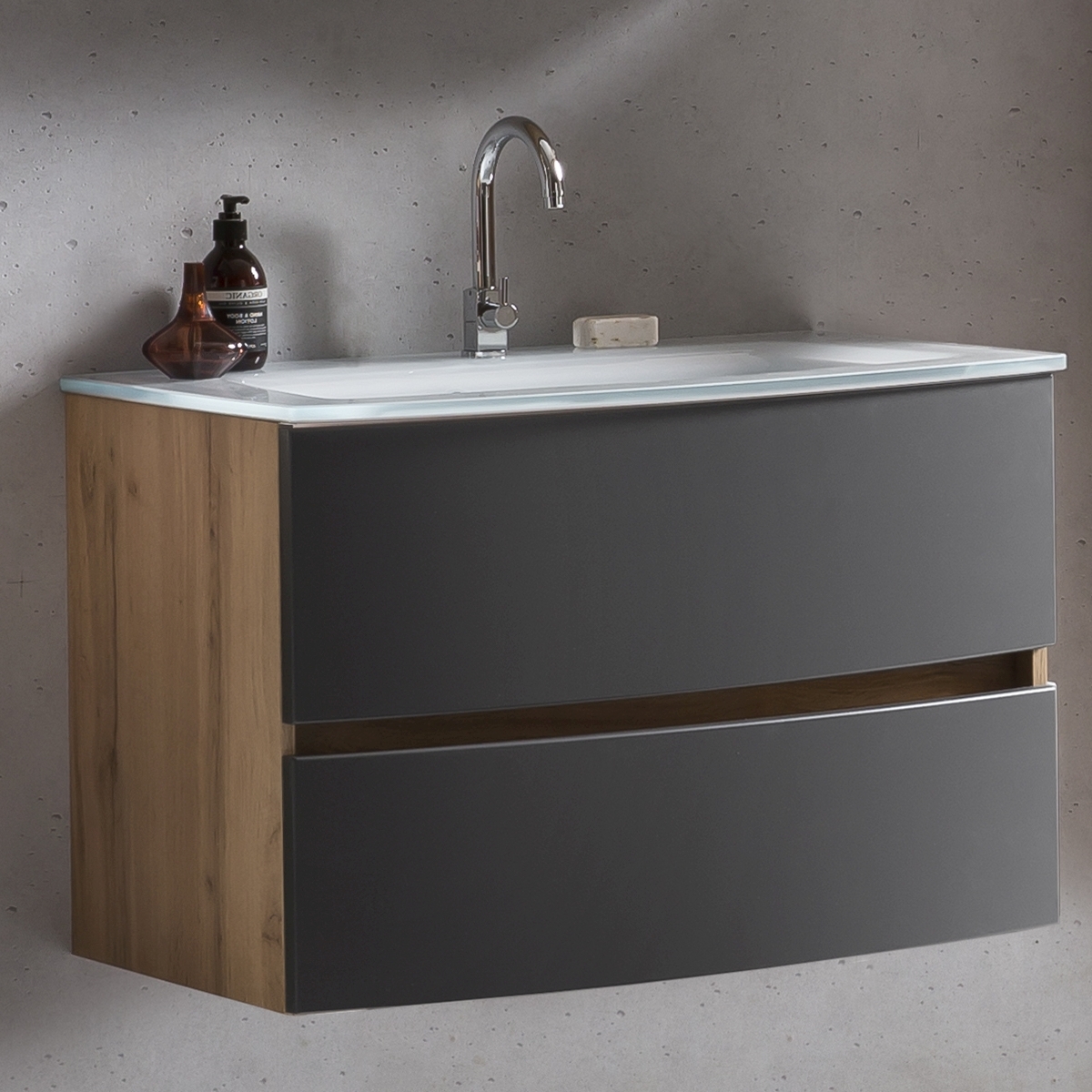Gefertigt aus hochwertigem Holzwerkstoff, punktet der Kolun-G mit seiner robusten Bauweise und Langlebigkeit. Das Eiche Dekor des Korpus verleiht dem Möbelstück einen besonderen Charme, während die matte Oberfläche des gesamten Schranks für eine zeitlose Ästhetik sorgt. Nutzen Sie diesen Waschbeckenunterschrank, um Ihr Badezimmer stilvoll aufzuwerten und gleichzeitig Platz für Ihre Utensilien zu schaffen. Erleben Sie, wie der Kolun-G Ihre Badezimmereinrichtung bereichert und für Ordnung sorgt.