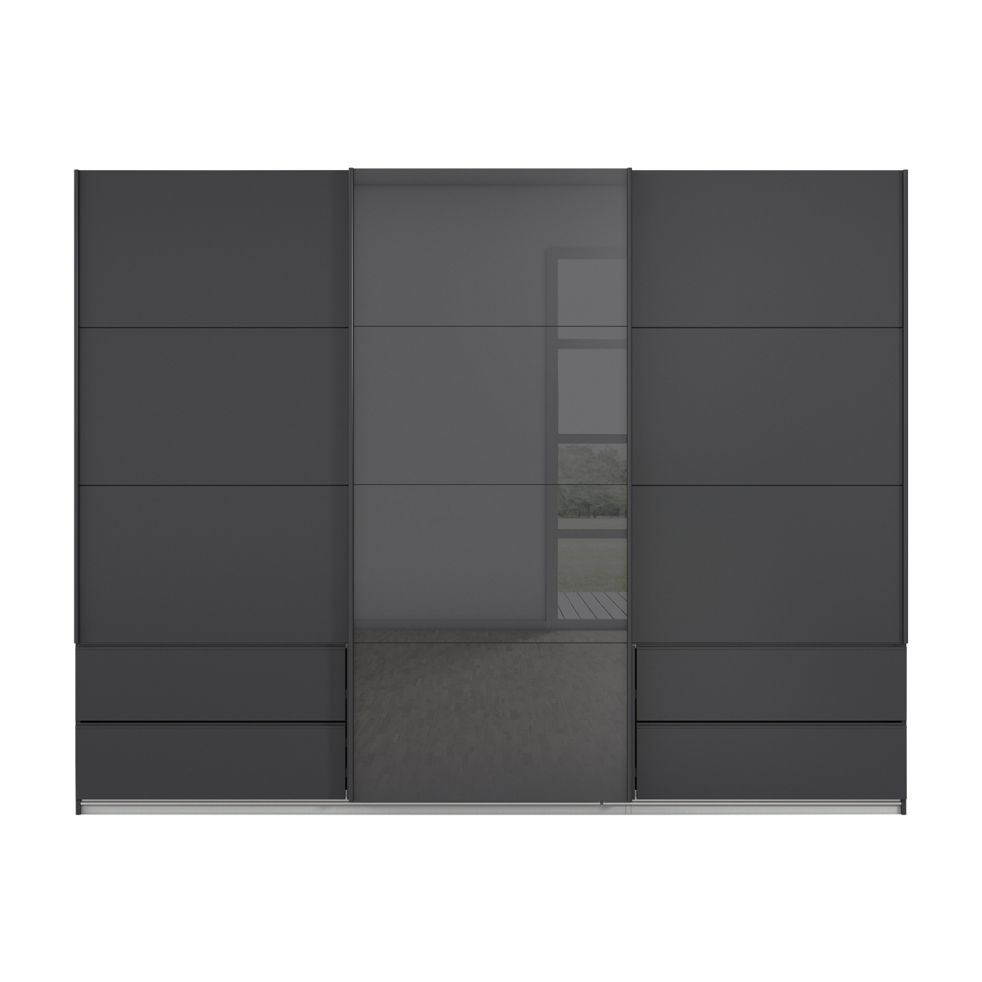 Entdecken Sie den Schwebetürenschrank Elsa, der durch sein elegantes Design und hochwertige Verarbeitung überzeugt. Die Türen des Schranks sind aus Glas gefertigt und in der stilvollen Farbe Basalt gehalten. Der Korpus besteht aus robustem Holzwerkstoff und ist in Grau matt lackiert. Highlight des Schranks ist die integrierte Beleuchtung sowie der Passepartout-Rahmen, die für eine ansprechende Optik sorgen.