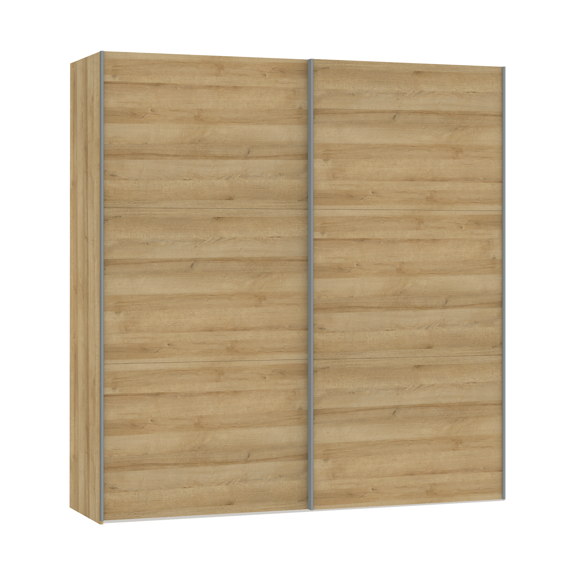 Die Griffe des Schranks sind aus robustem Metall gefertigt und bieten eine angenehme Haptik. Durch das Schwebetürendesign lässt sich der Schrank platzsparend öffnen und schließen, was besonders in kleineren Räumen von Vorteil ist. Innen bietet der Schwebetürenschrank ausreichend Stauraum für Kleidung und Accessoires, sodass alles ordentlich verstaut werden kann.