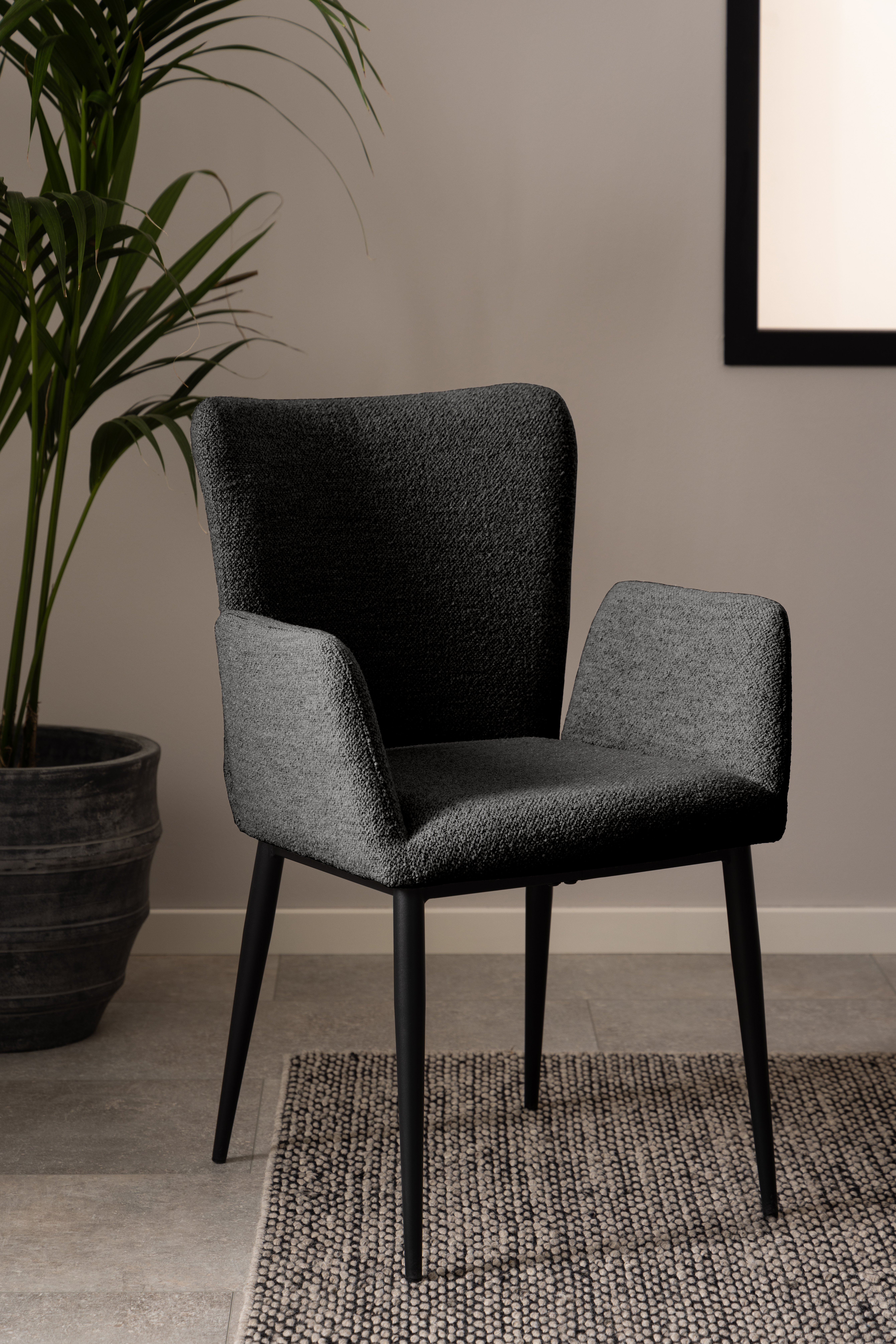 Set one by Musterring präsentiert den stilvollen Armlehnstuhl El Paso, der mit seinem modernen Design und hohen Komfort überzeugt. Der Stuhl besticht durch eine hochwertige Polsterung aus Polyurethanschaum und einen Bezug aus robustem Acryl und Polyester in elegantem Anthrazit. Das Gestell aus pulverbeschichtetem Stahl in mattem Schwarz sorgt für Stabilität und eine ansprechende Optik.