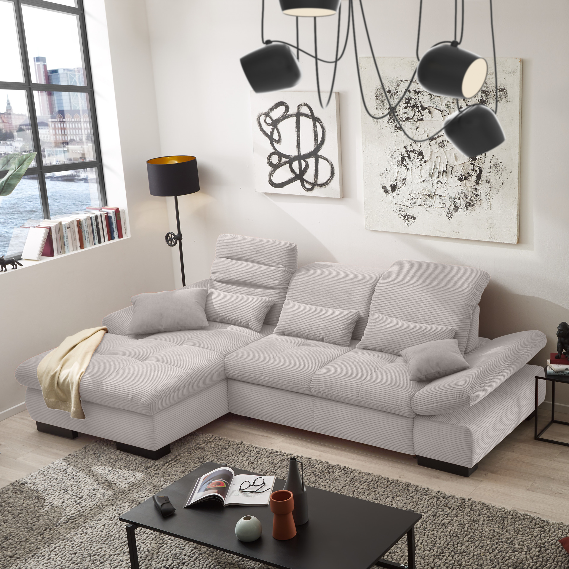 Das Ecksofa Cordula von set one by Musterring verbindet stilvolles Design mit höchstem Komfort. Der elegante graue Bezug aus kuschelweichem Cord verleiht dem Sofa eine moderne, zeitlose Optik. Die Polsterung aus hochwertigem Polyetherschaum und die Wellenunterfederung sorgen für ein angenehmes Sitzerlebnis.