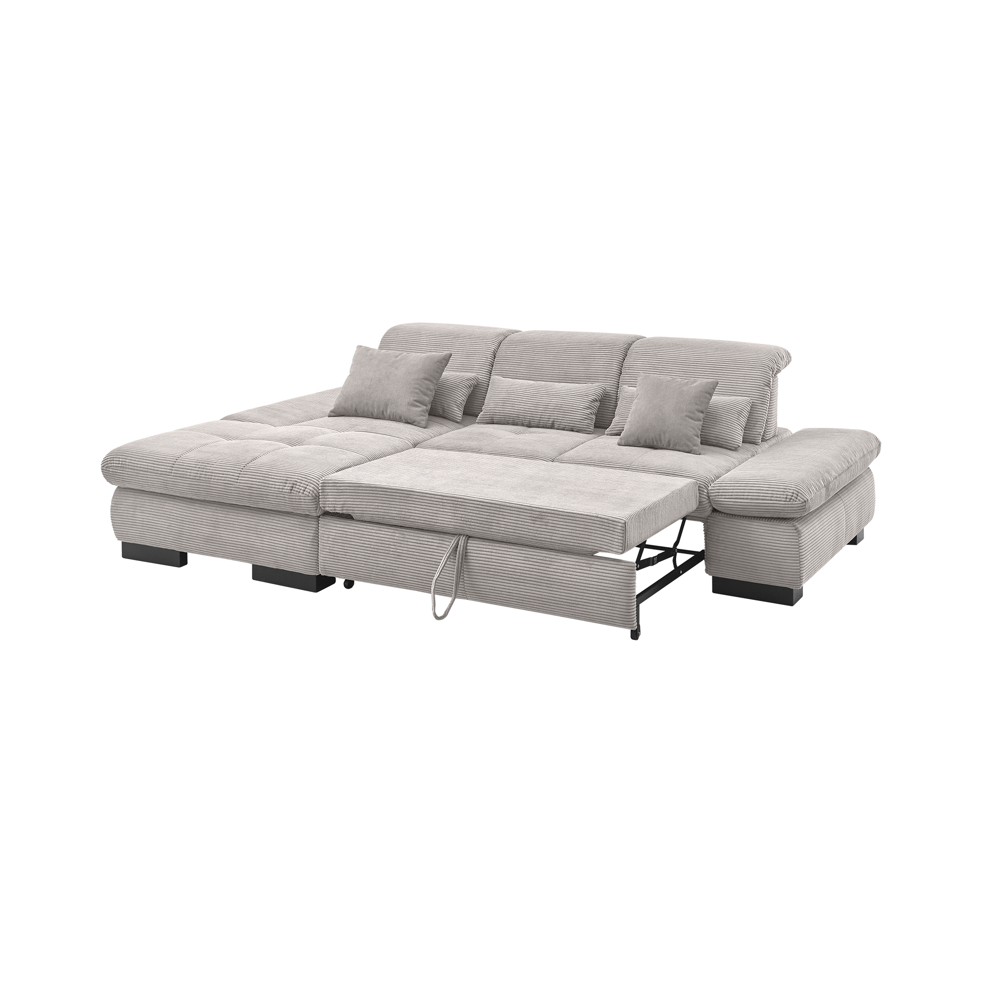 Mit einer Sitzhöhe von 43 cm bietet das Sofa optimalen Komfort, während die klappbaren Armlehnen und die schwenkbare Rückenlehne individuelle Anpassungen ermöglichen. Ein besonderes Highlight ist die ausziehbare Sitzfläche, die in Kombination mit der Bettfunktion des Gestells, das Sofa in ein gemütliches Bett verwandelt.