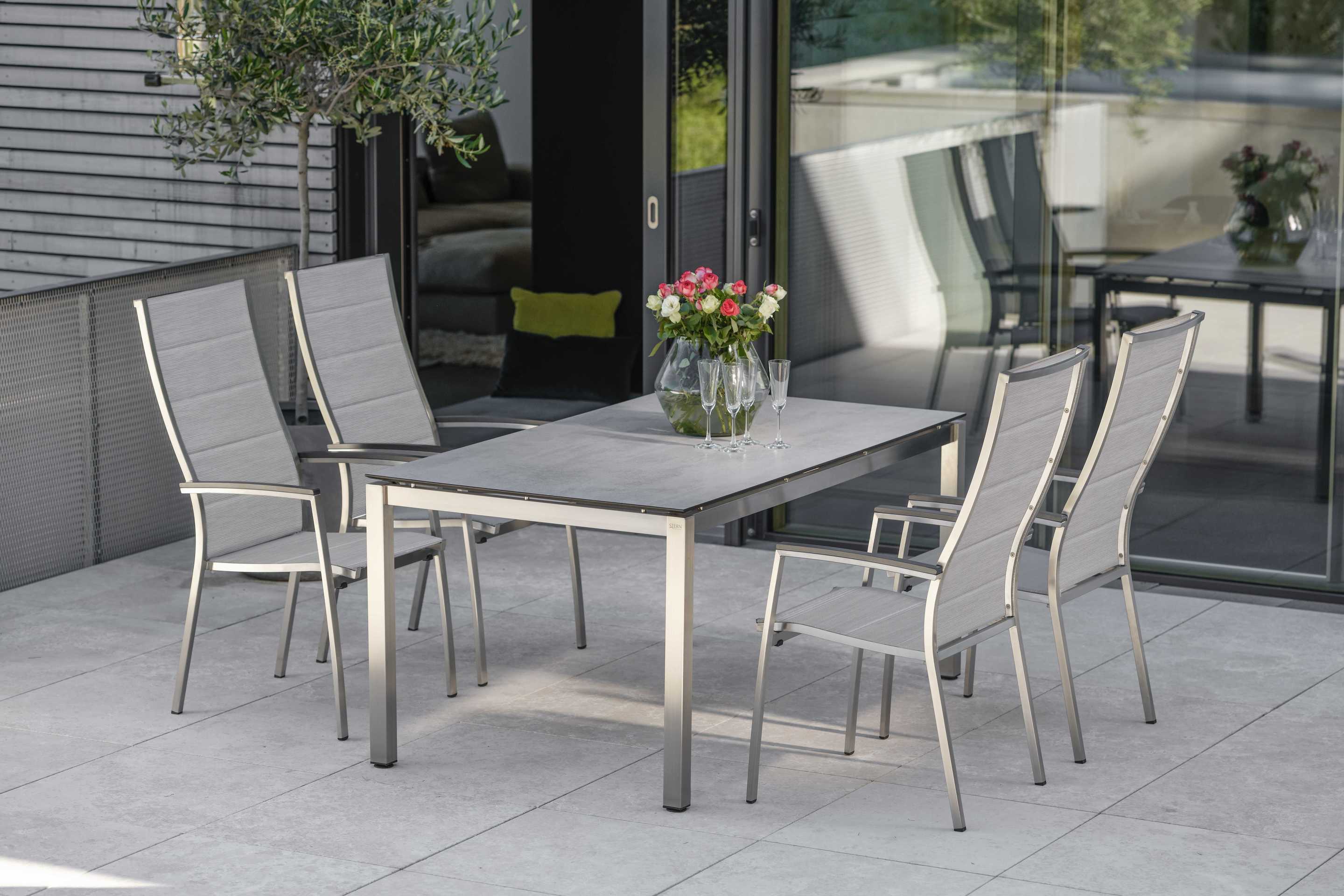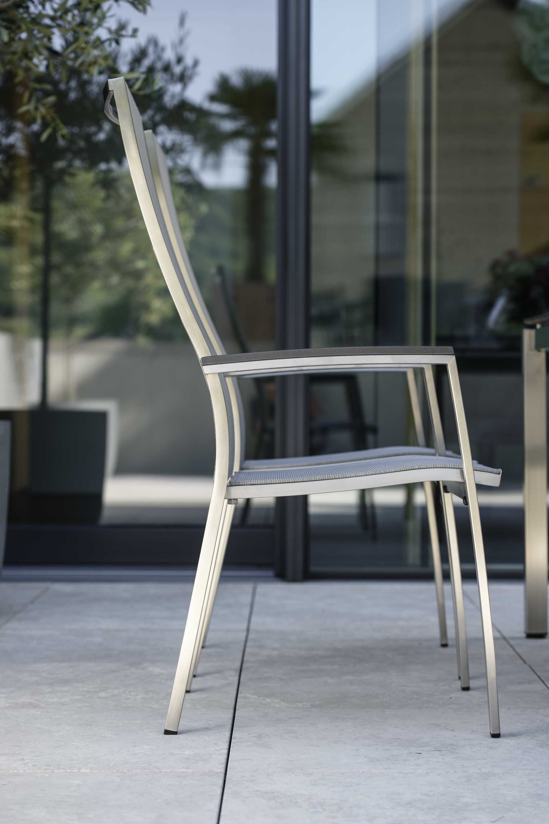 Der Stapelsessel Cardiff von Stern kombiniert durchdachtes Design mit hochwertiger Verarbeitung. Die Sitzhöhe und Sitztiefe von jeweils 46 cm bieten optimalen Sitzkomfort, während die extra hohe Rückenlehne zusätzlichen Halt gewährt. Der Bezug in Silber besteht aus strapazierfähigem Textilen und ist angenehm gepolstert. Das Gestell aus Edelstahl und die Armlehnen aus Aluminium, in Anthrazit gehalten, garantieren Stabilität und Langlebigkeit. Mit einer Höhe von 65 cm sind die Armlehnen perfekt positioniert, um Komfort zu bieten. Durch die stapelbare Konstruktion lässt sich der Sessel platzsparend verstauen, was ihn besonders für den Objektbereich geeignet macht. Der Cardiff Stapelsessel vereint Funktionalität mit modernem Design und ist die ideale Wahl für stilvolle Außenbereiche. Die harmonische Farbkombination aus Silber und Anthrazit fügt sich nahtlos in verschiedene Umgebungen ein und sorgt für ein ansprechendes Gesamtbild.